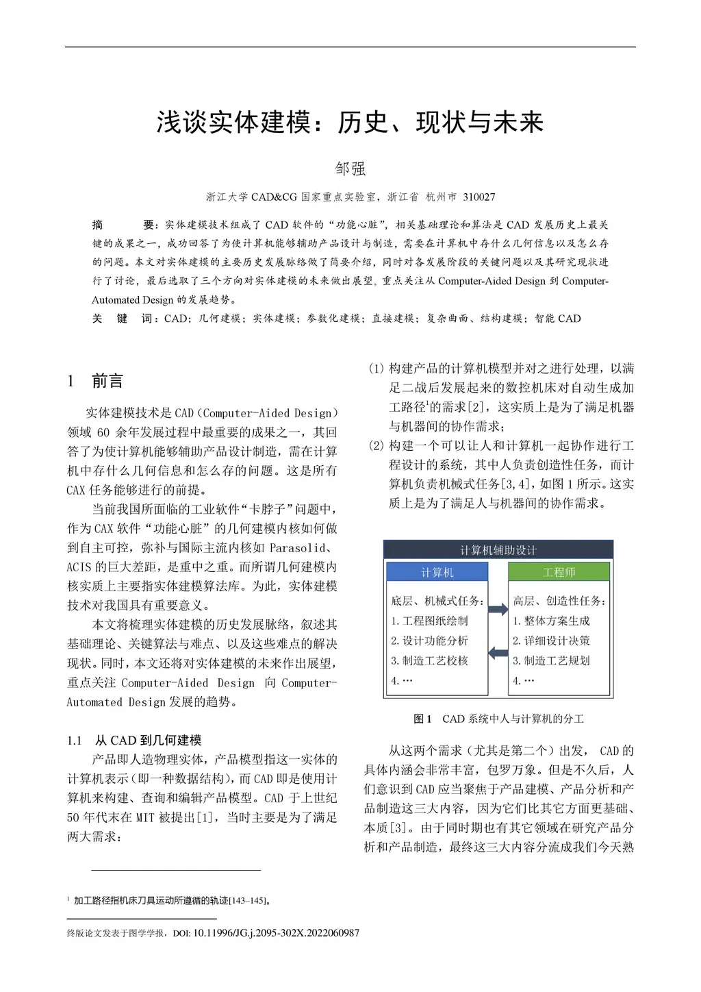 Solid modeling is a technique underlying CAD software as we see it today, and its theories and algorithms are among the most fundamental milestones in the historical development of CAD. Basically, it has answered the question of what geometric information a computer should store and how to store/manipulate them in order for the computer to aid the processes of design and manufacturing. This paper provides a brief review (in Chinese) on the historical development of solid modeling, its fundamental research problems, as well as their challenges and state of the art. It then concludes with three prospective trends of solid modeling, especially the promising paradigm shift from "Computer-Aided Design" to "Computer-Automated Design".