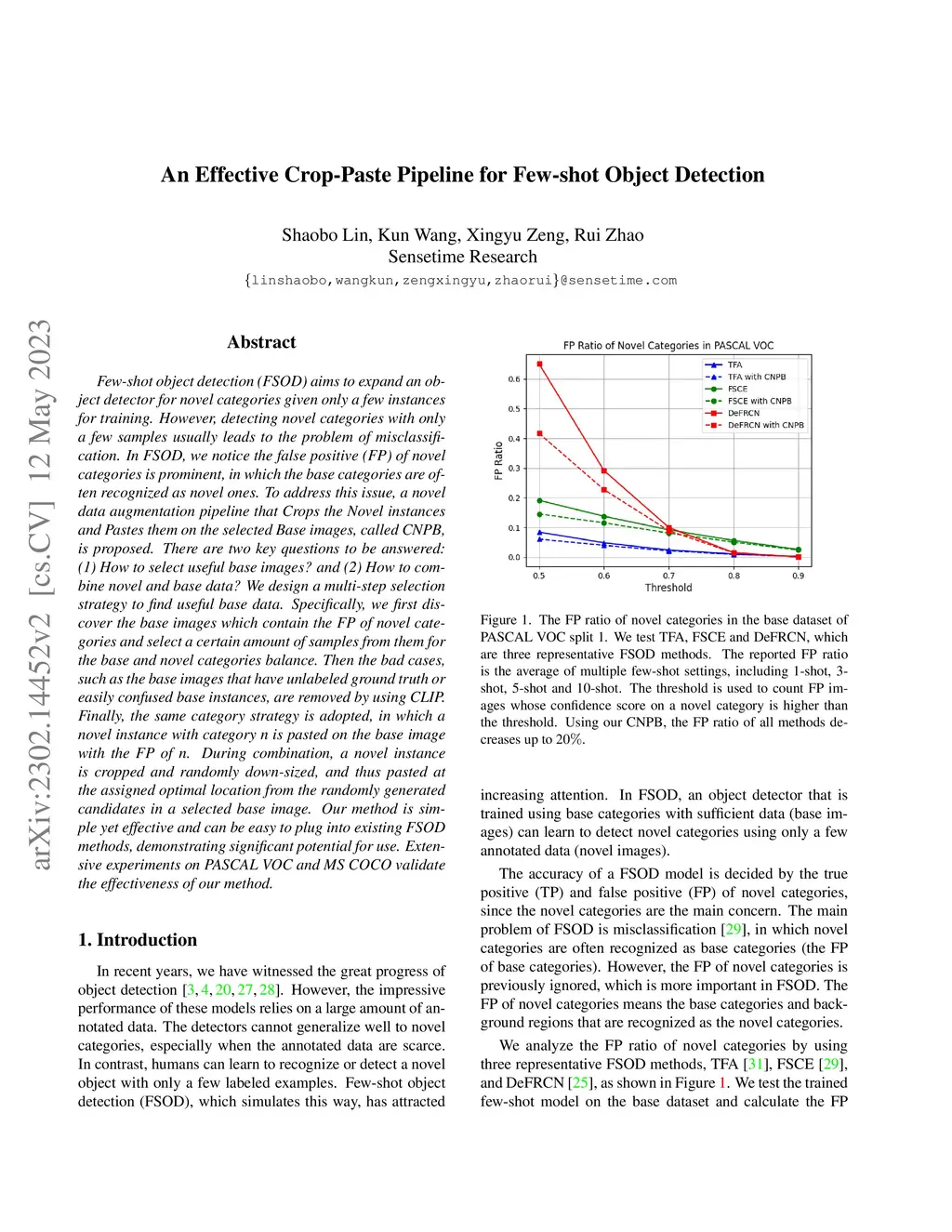 Few-shot object detection (FSOD) aims to expand an object detector for novel categories given only a few instances for training. However, detecting novel categories with only a few samples usually leads to the problem of misclassification. In FSOD, we notice the false positive (FP) of novel categories is prominent, in which the base categories are often recognized as novel ones. To address this issue, a novel data augmentation pipeline that Crops the Novel instances and Pastes them on the selected Base images, called CNPB, is proposed. There are two key questions to be answered: (1) How to select useful base images? and (2) How to combine novel and base data? We design a multi-step selection strategy to find useful base data. Specifically, we first discover the base images which contain the FP of novel categories and select a certain amount of samples from them for the base and novel categories balance. Then the bad cases, such as the base images that have unlabeled ground truth or easily confused base instances, are removed by using CLIP. Finally, the same category strategy is adopted, in which a novel instance with category n is pasted on the base image with the FP of n. During combination, a novel instance is cropped and randomly down-sized, and thus pasted at the assigned optimal location from the randomly generated candidates in a selected base image. Our method is simple yet effective and can be easy to plug into existing FSOD methods, demonstrating significant potential for use. Extensive experiments on PASCAL VOC and MS COCO validate the effectiveness of our method.