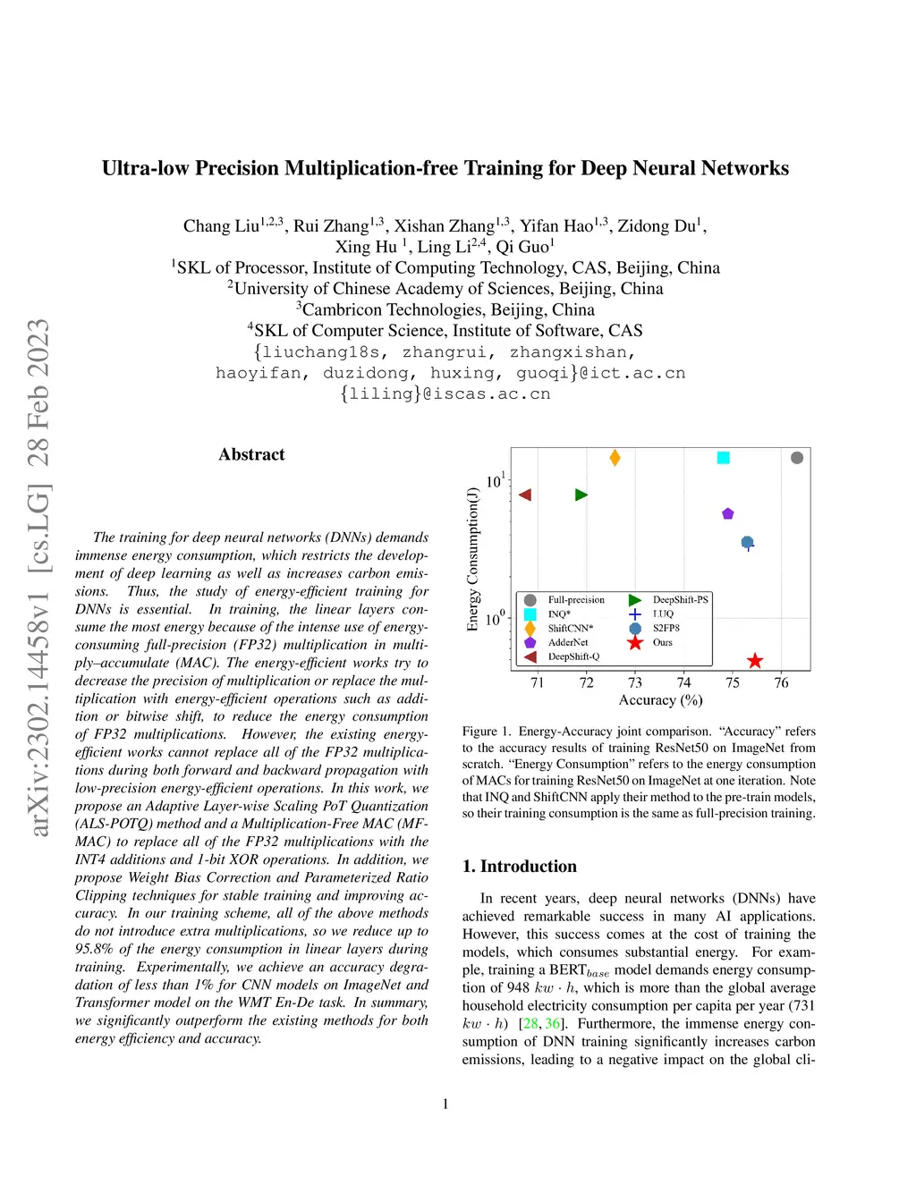 The training for deep neural networks (DNNs) demands immense energy consumption, which restricts the development of deep learning as well as increases carbon emissions. Thus, the study of energy-efficient training for DNNs is essential. In training, the linear layers consume the most energy because of the intense use of energy-consuming full-precision (FP32) multiplication in multiply-accumulate (MAC). The energy-efficient works try to decrease the precision of multiplication or replace the multiplication with energy-efficient operations such as addition or bitwise shift, to reduce the energy consumption of FP32 multiplications. However, the existing energy-efficient works cannot replace all of the FP32 multiplications during both forward and backward propagation with low-precision energy-efficient operations. In this work, we propose an Adaptive Layer-wise Scaling PoT Quantization (ALS-POTQ) method and a Multiplication-Free MAC (MF-MAC) to replace all of the FP32 multiplications with the INT4 additions and 1-bit XOR operations. In addition, we propose Weight Bias Correction and Parameterized Ratio Clipping techniques for stable training and improving accuracy. In our training scheme, all of the above methods do not introduce extra multiplications, so we reduce up to 95.8% of the energy consumption in linear layers during training. Experimentally, we achieve an accuracy degradation of less than 1% for CNN models on ImageNet and Transformer model on the WMT En-De task. In summary, we significantly outperform the existing methods for both energy efficiency and accuracy.