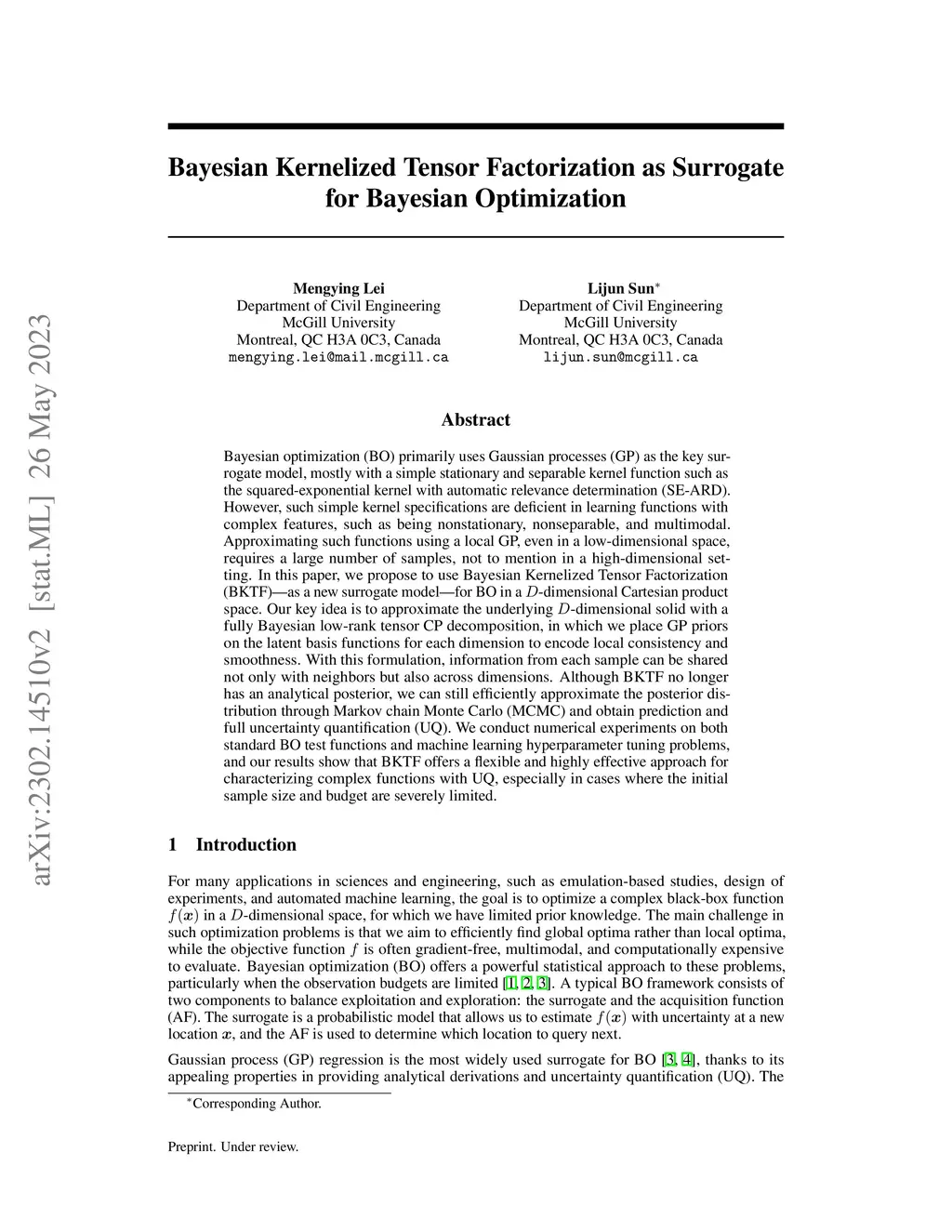 Bayesian optimization (BO) primarily uses Gaussian processes (GP) as the key surrogate model, mostly with a simple stationary and separable kernel function such as the squared-exponential kernel with automatic relevance determination (SE-ARD). However, such simple kernel specifications are deficient in learning functions with complex features, such as being nonstationary, nonseparable, and multimodal. Approximating such functions using a local GP, even in a low-dimensional space, requires a large number of samples, not to mention in a high-dimensional setting. In this paper, we propose to use Bayesian Kernelized Tensor Factorization (BKTF) -- as a new surrogate model -- for BO in a -dimensional Cartesian product space. Our key idea is to approximate the underlying -dimensional solid with a fully Bayesian low-rank tensor CP decomposition, in which we place GP priors on the latent basis functions for each dimension to encode local consistency and smoothness. With this formulation, information from each sample can be shared not only with neighbors but also across dimensions. Although BKTF no longer has an analytical posterior, we can still efficiently approximate the posterior distribution through Markov chain Monte Carlo (MCMC) and obtain prediction and full uncertainty quantification (UQ). We conduct numerical experiments on both standard BO test functions and machine learning hyperparameter tuning problems, and our results show that BKTF offers a flexible and highly effective approach for characterizing complex functions with UQ, especially in cases where the initial sample size and budget are severely limited.