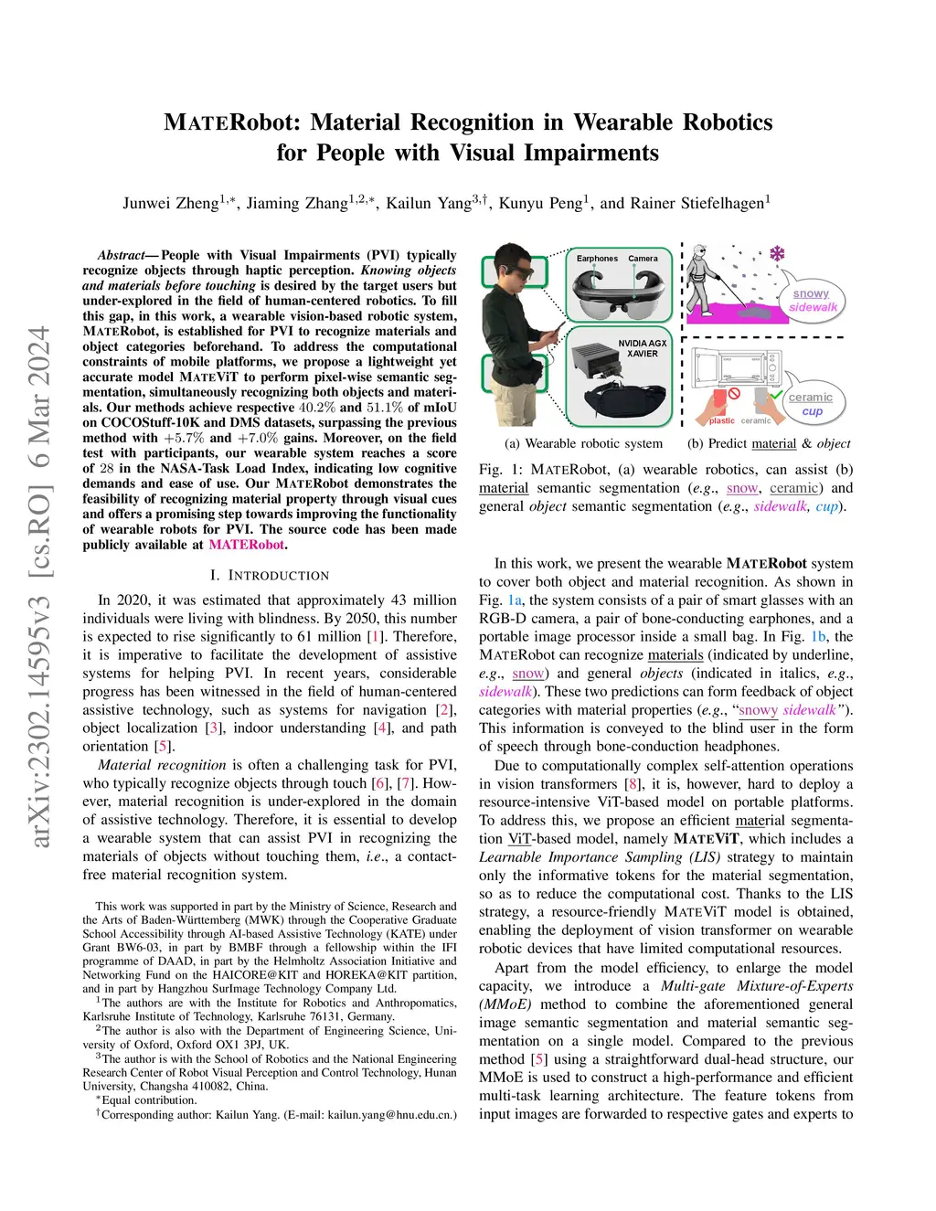 People with Visual Impairments (PVI) typically recognize objects through haptic perception. Knowing objects and materials before touching is desired by the target users but under-explored in the field of human-centered robotics. To fill this gap, in this work, a wearable vision-based robotic system, MateRobot, is established for PVI to recognize materials and object categories beforehand. To address the computational constraints of mobile platforms, we propose a lightweight yet accurate model MateViT to perform pixel-wise semantic segmentation, simultaneously recognizing both objects and materials. Our methods achieve respective 40.2% and 51.1% of mIoU on COCOStuff-10K and DMS datasets, surpassing the previous method with +5.7% and +7.0% gains. Moreover, on the field test with participants, our wearable system reaches a score of 28 in the NASA-Task Load Index, indicating low cognitive demands and ease of use. Our MateRobot demonstrates the feasibility of recognizing material property through visual cues and offers a promising step towards improving the functionality of wearable robots for PVI. The source code has been made publicly available at https://junweizheng93.github.io/publications/MATERobot/MATERobot.html.