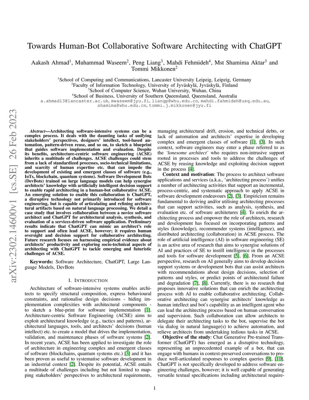 Architecting software-intensive systems can be a complex process. It deals with the daunting tasks of unifying stakeholders' perspectives, designers' intellect, tool-based automation, pattern-driven reuse, and so on, to sketch a blueprint that guides software implementation and evaluation. Despite its benefits, architecture-centric software engineering (ACSE) inherits a multitude of challenges. ACSE challenges could stem from a lack of standardized processes, socio-technical limitations, and scarcity of human expertise etc. that can impede the development of existing and emergent classes of software (e.g., IoTs, blockchain, quantum systems). Software Development Bots (DevBots) trained on large language models can help synergise architects' knowledge with artificially intelligent decision support to enable rapid architecting in a human-bot collaborative ACSE. An emerging solution to enable this collaboration is ChatGPT, a disruptive technology not primarily introduced for software engineering, but is capable of articulating and refining architectural artifacts based on natural language processing. We detail a case study that involves collaboration between a novice software architect and ChatGPT for architectural analysis, synthesis, and evaluation of a services-driven software application. Preliminary results indicate that ChatGPT can mimic an architect's role to support and often lead ACSE, however; it requires human oversight and decision support for collaborative architecting. Future research focuses on harnessing empirical evidence about architects' productivity and exploring socio-technical aspects of architecting with ChatGPT to tackle emerging and futuristic challenges of ACSE.