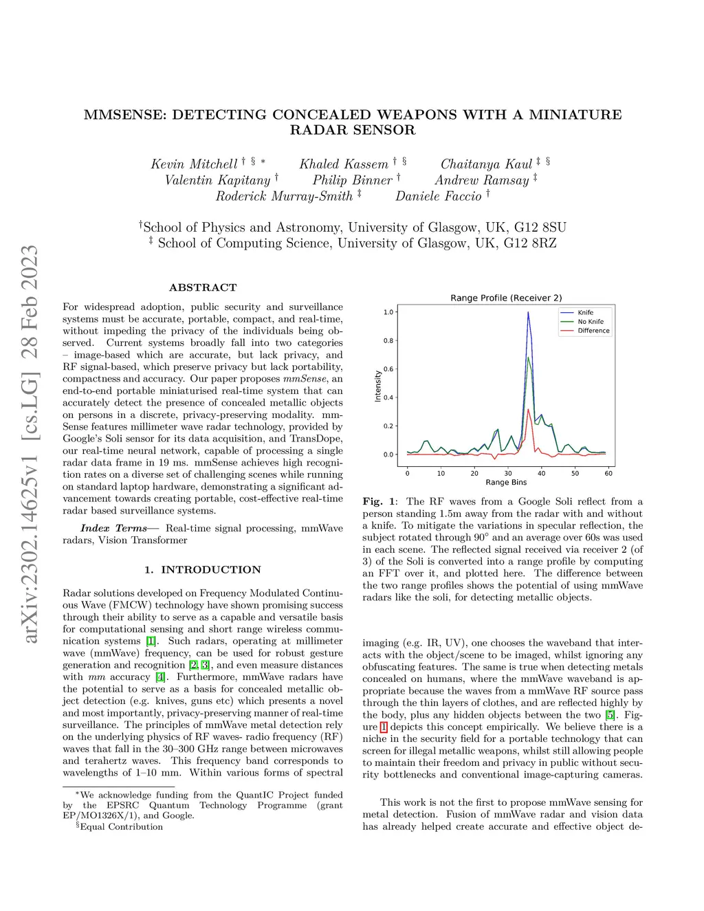 For widespread adoption, public security and surveillance systems must be accurate, portable, compact, and real-time, without impeding the privacy of the individuals being observed. Current systems broadly fall into two categories -- image-based which are accurate, but lack privacy, and RF signal-based, which preserve privacy but lack portability, compactness and accuracy. Our paper proposes mmSense, an end-to-end portable miniaturised real-time system that can accurately detect the presence of concealed metallic objects on persons in a discrete, privacy-preserving modality. mmSense features millimeter wave radar technology, provided by Google's Soli sensor for its data acquisition, and TransDope, our real-time neural network, capable of processing a single radar data frame in 19 ms. mmSense achieves high recognition rates on a diverse set of challenging scenes while running on standard laptop hardware, demonstrating a significant advancement towards creating portable, cost-effective real-time radar based surveillance systems.