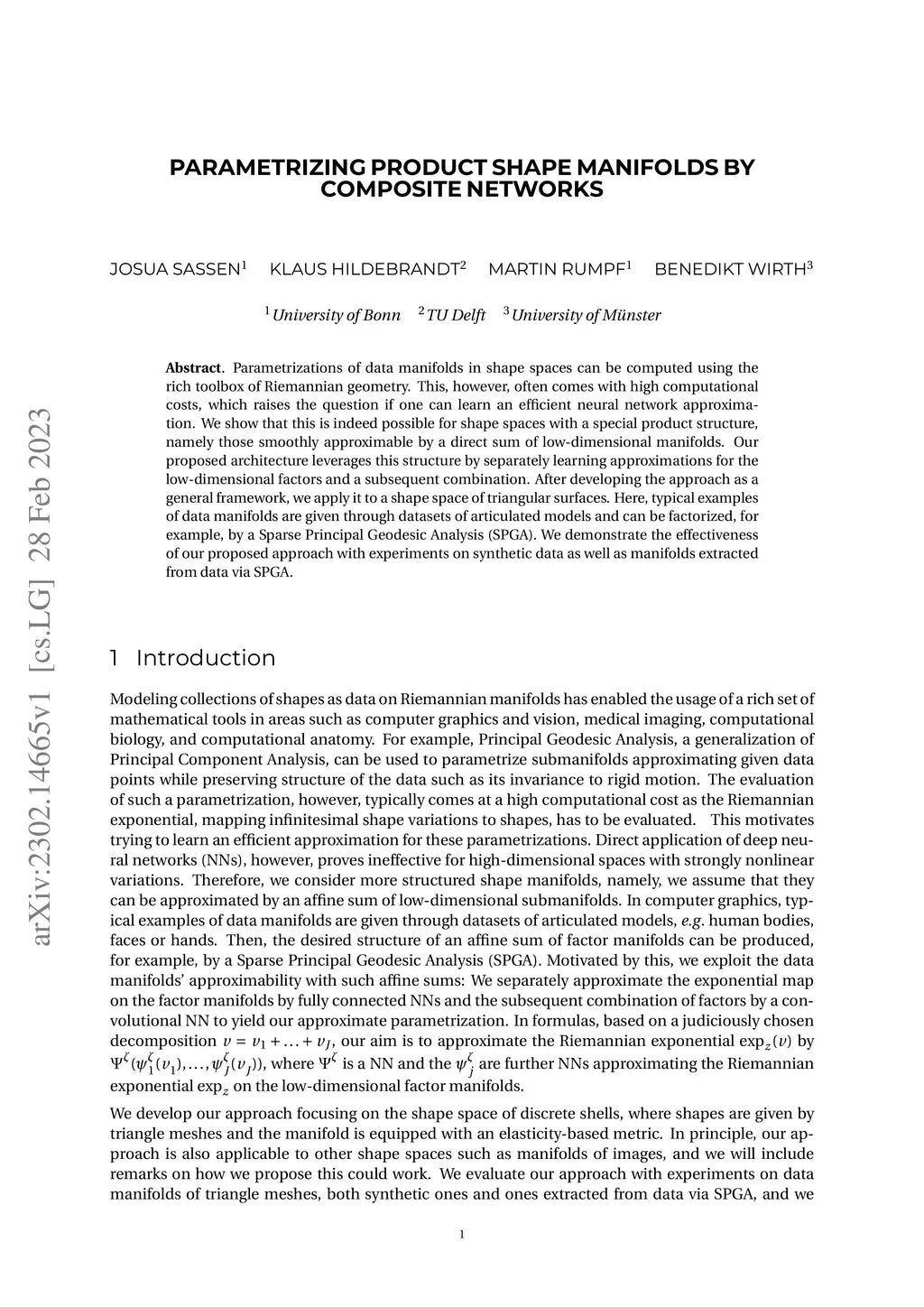Parametrizations of data manifolds in shape spaces can be computed using the rich toolbox of Riemannian geometry. This, however, often comes with high computational costs, which raises the question if one can learn an efficient neural network approximation. We show that this is indeed possible for shape spaces with a special product structure, namely those smoothly approximable by a direct sum of low-dimensional manifolds. Our proposed architecture leverages this structure by separately learning approximations for the low-dimensional factors and a subsequent combination. After developing the approach as a general framework, we apply it to a shape space of triangular surfaces. Here, typical examples of data manifolds are given through datasets of articulated models and can be factorized, for example, by a Sparse Principal Geodesic Analysis (SPGA). We demonstrate the effectiveness of our proposed approach with experiments on synthetic data as well as manifolds extracted from data via SPGA.