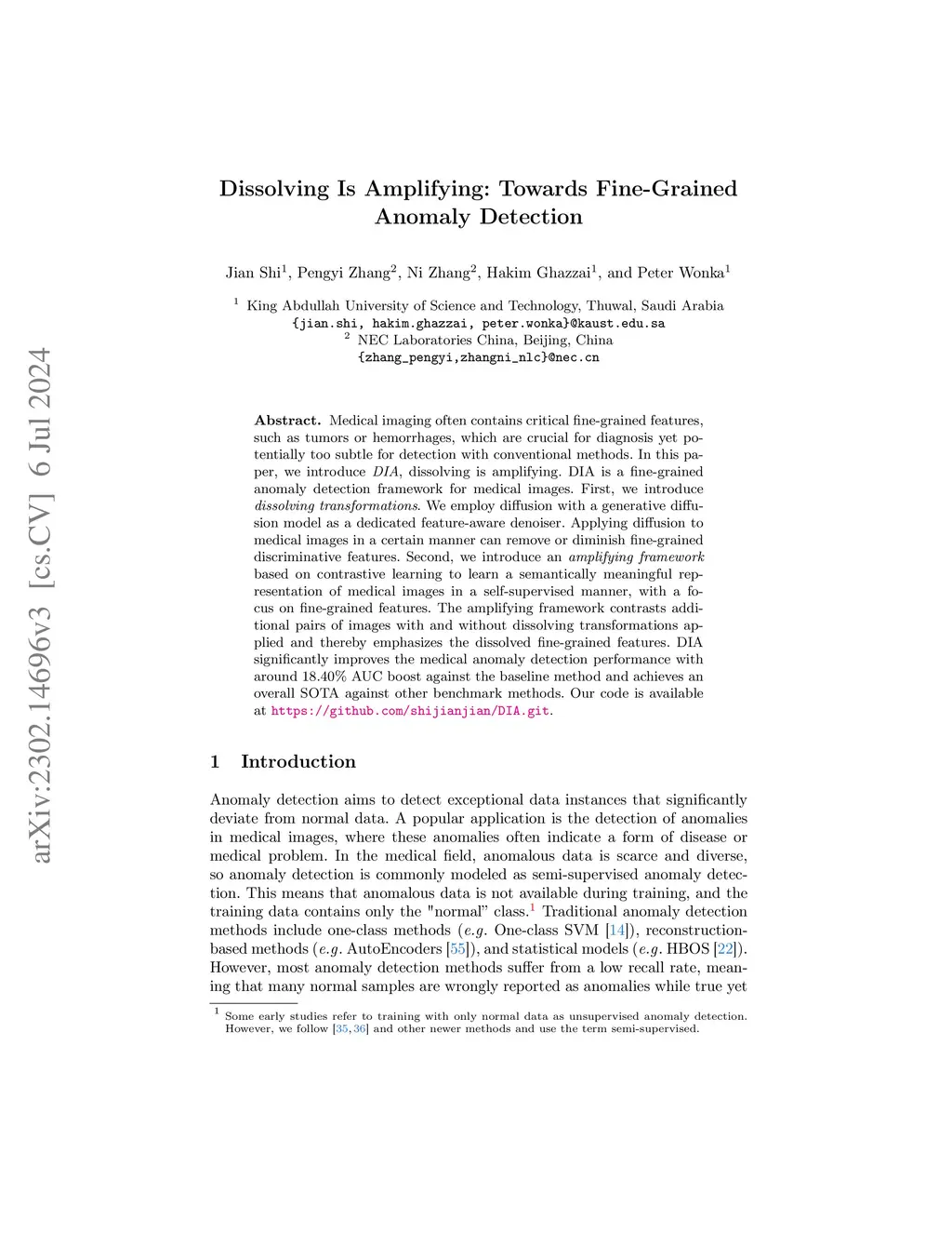 Medical imaging often contains critical fine-grained features, such as tumors or hemorrhages, crucial for diagnosis yet potentially too subtle for detection with conventional methods. In this paper, we introduce \textit{DIA}, dissolving is amplifying. DIA is a fine-grained anomaly detection framework for medical images. First, we introduce \textit{dissolving transformations}. We employ diffusion with a generative diffusion model as a dedicated feature-aware denoiser. Applying diffusion to medical images in a certain manner can remove or diminish fine-grained discriminative features. Second, we introduce an \textit{amplifying framework} based on contrastive learning to learn a semantically meaningful representation of medical images in a self-supervised manner, with a focus on fine-grained features. The amplifying framework contrasts additional pairs of images with and without dissolving transformations applied and thereby emphasizes the dissolved fine-grained features. DIA significantly improves the medical anomaly detection performance with around 18.40\% AUC boost against the baseline method and achieves an overall SOTA against other benchmark methods. Our code is available at \url{https://github.com/shijianjian/DIA.git}.