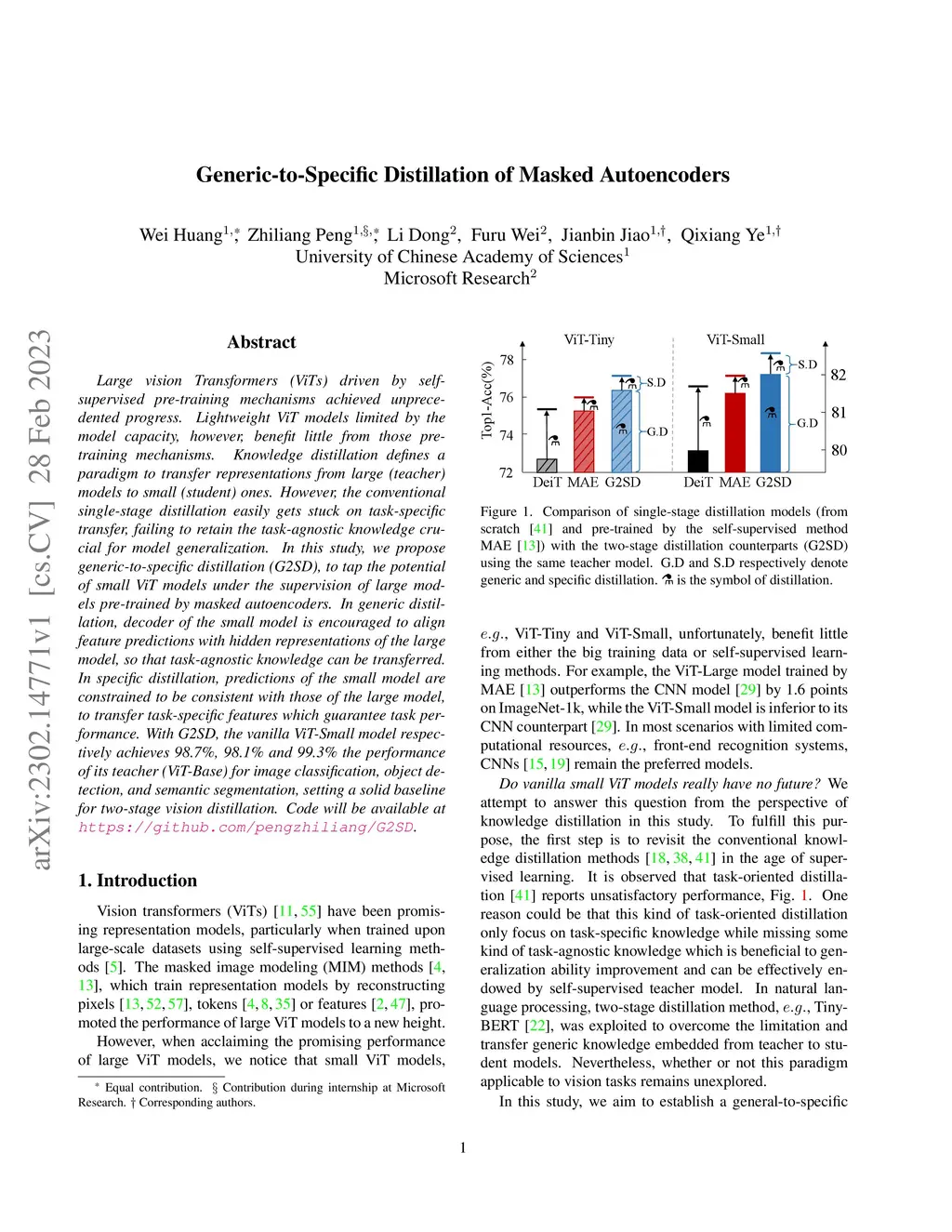 Large vision Transformers (ViTs) driven by self-supervised pre-training mechanisms achieved unprecedented progress. Lightweight ViT models limited by the model capacity, however, benefit little from those pre-training mechanisms. Knowledge distillation defines a paradigm to transfer representations from large (teacher) models to small (student) ones. However, the conventional single-stage distillation easily gets stuck on task-specific transfer, failing to retain the task-agnostic knowledge crucial for model generalization. In this study, we propose generic-to-specific distillation (G2SD), to tap the potential of small ViT models under the supervision of large models pre-trained by masked autoencoders. In generic distillation, decoder of the small model is encouraged to align feature predictions with hidden representations of the large model, so that task-agnostic knowledge can be transferred. In specific distillation, predictions of the small model are constrained to be consistent with those of the large model, to transfer task-specific features which guarantee task performance. With G2SD, the vanilla ViT-Small model respectively achieves 98.7%, 98.1% and 99.3% the performance of its teacher (ViT-Base) for image classification, object detection, and semantic segmentation, setting a solid baseline for two-stage vision distillation. Code will be available at https://github.com/pengzhiliang/G2SD.