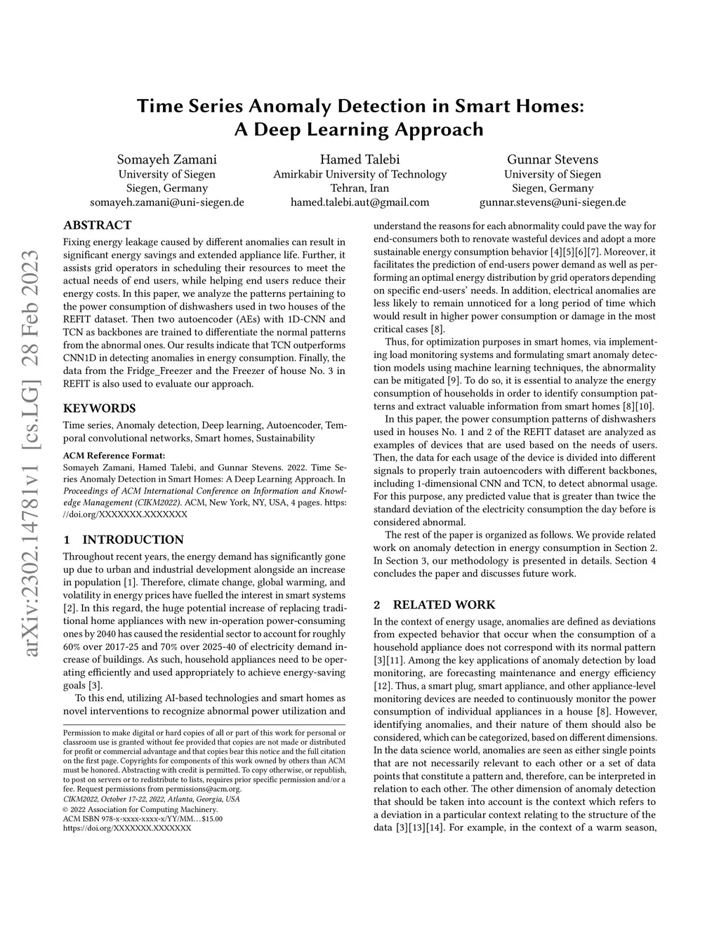 Fixing energy leakage caused by different anomalies can result in significant energy savings and extended appliance life. Further, it assists grid operators in scheduling their resources to meet the actual needs of end users, while helping end users reduce their energy costs. In this paper, we analyze the patterns pertaining to the power consumption of dishwashers used in two houses of the REFIT dataset. Then two autoencoder (AEs) with 1D-CNN and TCN as backbones are trained to differentiate the normal patterns from the abnormal ones. Our results indicate that TCN outperforms CNN1D in detecting anomalies in energy consumption. Finally, the data from the Fridge_Freezer and the Freezer of house No. 3 in REFIT is also used to evaluate our approach.