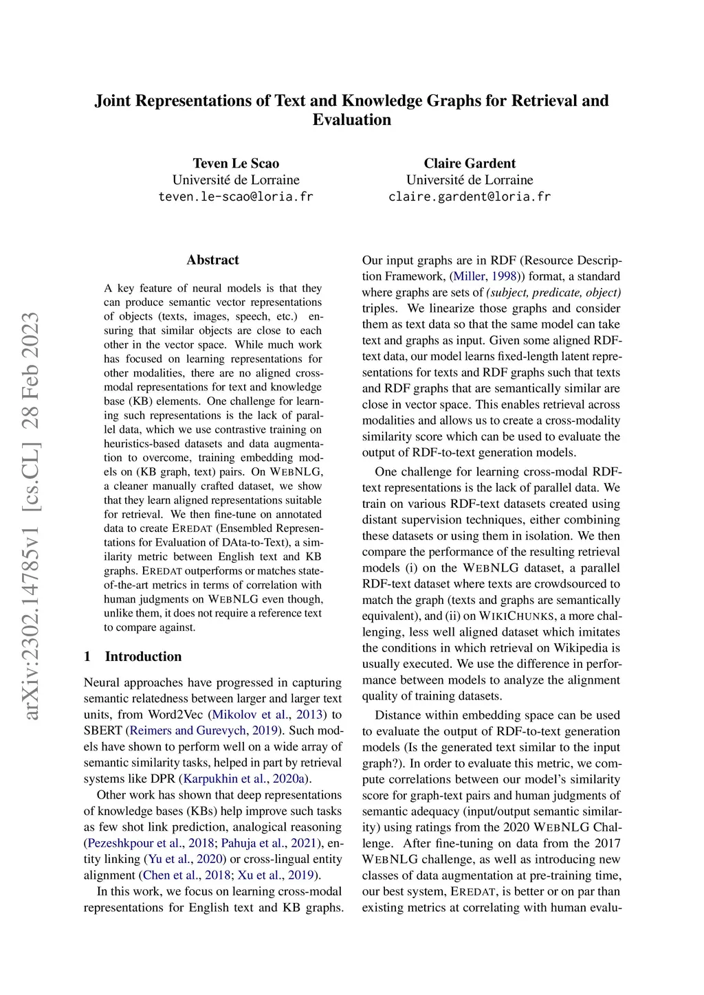 A key feature of neural models is that they can produce semantic vector representations of objects (texts, images, speech, etc.) ensuring that similar objects are close to each other in the vector space. While much work has focused on learning representations for other modalities, there are no aligned cross-modal representations for text and knowledge base (KB) elements. One challenge for learning such representations is the lack of parallel data, which we use contrastive training on heuristics-based datasets and data augmentation to overcome, training embedding models on (KB graph, text) pairs. On WebNLG, a cleaner manually crafted dataset, we show that they learn aligned representations suitable for retrieval. We then fine-tune on annotated data to create EREDAT (Ensembled Representations for Evaluation of DAta-to-Text), a similarity metric between English text and KB graphs. EREDAT outperforms or matches state-of-the-art metrics in terms of correlation with human judgments on WebNLG even though, unlike them, it does not require a reference text to compare against.