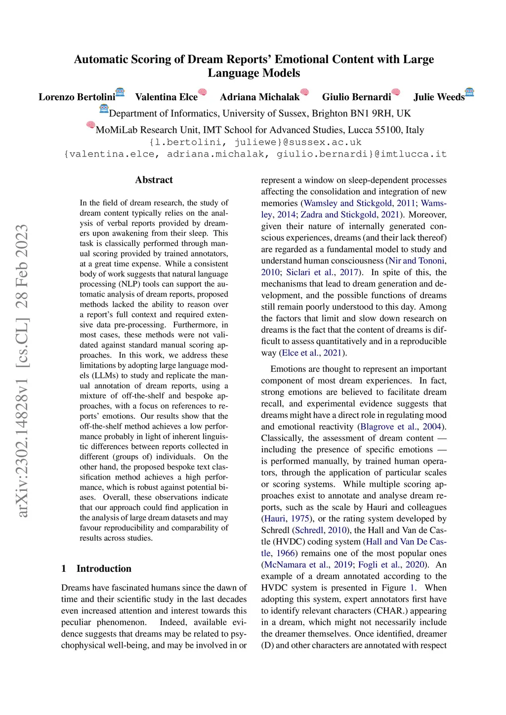 In the field of dream research, the study of dream content typically relies on the analysis of verbal reports provided by dreamers upon awakening from their sleep. This task is classically performed through manual scoring provided by trained annotators, at a great time expense. While a consistent body of work suggests that natural language processing (NLP) tools can support the automatic analysis of dream reports, proposed methods lacked the ability to reason over a report's full context and required extensive data pre-processing. Furthermore, in most cases, these methods were not validated against standard manual scoring approaches. In this work, we address these limitations by adopting large language models (LLMs) to study and replicate the manual annotation of dream reports, using a mixture of off-the-shelf and bespoke approaches, with a focus on references to reports' emotions. Our results show that the off-the-shelf method achieves a low performance probably in light of inherent linguistic differences between reports collected in different (groups of) individuals. On the other hand, the proposed bespoke text classification method achieves a high performance, which is robust against potential biases. Overall, these observations indicate that our approach could find application in the analysis of large dream datasets and may favour reproducibility and comparability of results across studies.