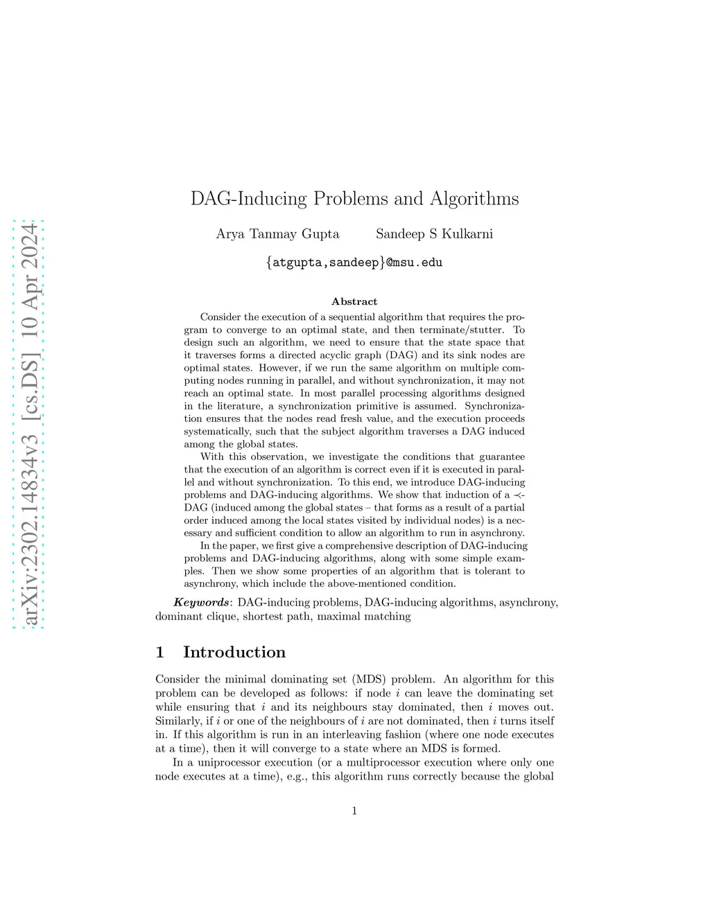 Consider the execution of a sequential algorithm that requires the program to converge to an optimal state, and then terminate/stutter. To design such an algorithm, we need to ensure that the state space that it traverses forms a directed acyclic graph (DAG) and its sink nodes are optimal states. However, if we run the same algorithm on multiple computing nodes running in parallel, and without synchronization, it may not reach an optimal state. In most parallel processing algorithms designed in the literature, a synchronization primitive is assumed. Synchronization ensures that the nodes read fresh value, and the execution proceeds systematically, such that the subject algorithm traverses a DAG induced among the global states. With this observation, we investigate the conditions that guarantee that the execution of an algorithm is correct even if it is executed in parallel and without synchronization. To this end, we introduce DAG-inducing problems and DAG-inducing algorithms. We show that induction of a -DAG (induced among the global states -- that forms as a result of a partial order induced among the local states visited by individual nodes) is a necessary and sufficient condition to allow an algorithm to run in asynchrony. In the paper, we first give a comprehensive description of DAG-inducing problems and DAG-inducing algorithms, along with some simple examples. Then we show some properties of an algorithm that is tolerant to asynchrony, which include the above-mentioned condition.