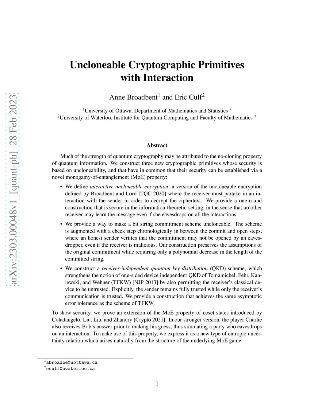 Much of the strength of quantum cryptography may be attributed to the no-cloning property of quantum information. We construct three new cryptographic primitives whose security is based on uncloneability, and that have in common that their security can be established via a novel monogamy-of-entanglement (MoE) property: - We define interactive uncloneable encryption, a version of the uncloneable encryption defined by Broadbent and Lord [TQC 2020] where the receiver must partake in an interaction with the sender in order to decrypt the ciphertext. We provide a one-round construction that is secure in the information-theoretic setting, in the sense that no other receiver may learn the message even if she eavesdrops on all the interactions. - We provide a way to make a bit string commitment scheme uncloneable. The scheme is augmented with a check step chronologically in between the commit and open steps, where an honest sender verifies that the commitment may not be opened by an eavesdropper, even if the receiver is malicious. - We construct a receiver-independent quantum key distribution (QKD) scheme, which strengthens the notion of one-sided device independent QKD of Tomamichel, Fehr, Kaniewski, and Wehner (TFKW) [NJP 2013] by also permitting the receiver's classical device to be untrusted. Explicitly, the sender remains fully trusted while only the receiver's communication is trusted. To show security, we prove an extension of the MoE property of coset states introduced by Coladangelo, Liu, Liu, and Zhandry [Crypto 2021]. In our stronger version, the player Charlie also receives Bob's answer prior to making his guess, simulating a party who eavesdrops on an interaction. To use this property, we express it as a new type of entropic uncertainty relation which arises naturally from the structure of the underlying MoE game.