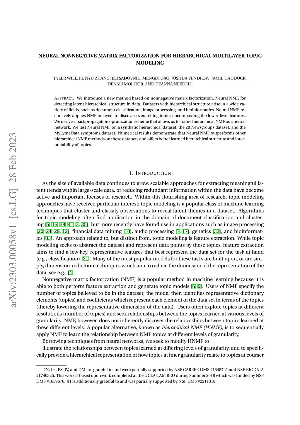 We introduce a new method based on nonnegative matrix factorization, Neural NMF, for detecting latent hierarchical structure in data. Datasets with hierarchical structure arise in a wide variety of fields, such as document classification, image processing, and bioinformatics. Neural NMF recursively applies NMF in layers to discover overarching topics encompassing the lower-level features. We derive a backpropagation optimization scheme that allows us to frame hierarchical NMF as a neural network. We test Neural NMF on a synthetic hierarchical dataset, the 20 Newsgroups dataset, and the MyLymeData symptoms dataset. Numerical results demonstrate that Neural NMF outperforms other hierarchical NMF methods on these data sets and offers better learned hierarchical structure and interpretability of topics.