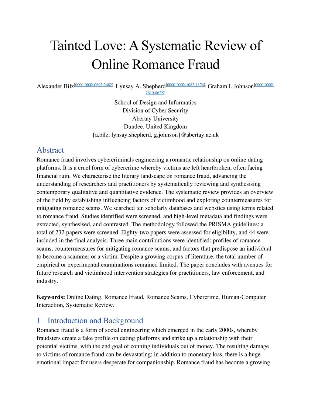 Tainted Love: A Systematic Review of Online Romance Fraud