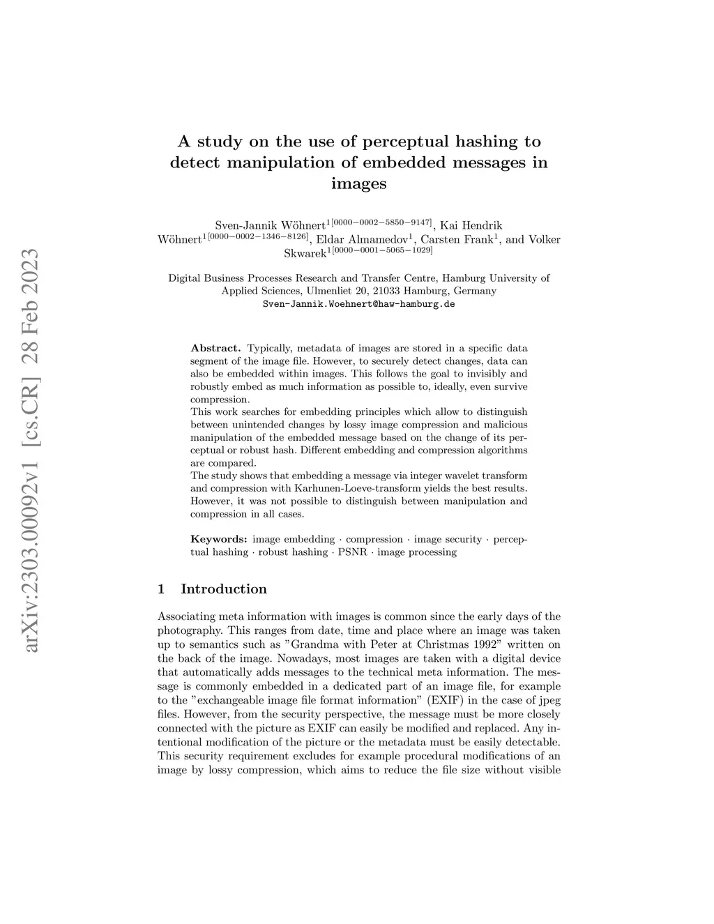 Typically, metadata of images are stored in a specific data segment of the image file. However, to securely detect changes, data can also be embedded within images. This follows the goal to invisibly and robustly embed as much information as possible to, ideally, even survive compression. This work searches for embedding principles which allow to distinguish between unintended changes by lossy image compression and malicious manipulation of the embedded message based on the change of its perceptual or robust hash. Different embedding and compression algorithms are compared. The study shows that embedding a message via integer wavelet transform and compression with Karhunen-Loeve-transform yields the best results. However, it was not possible to distinguish between manipulation and compression in all cases.