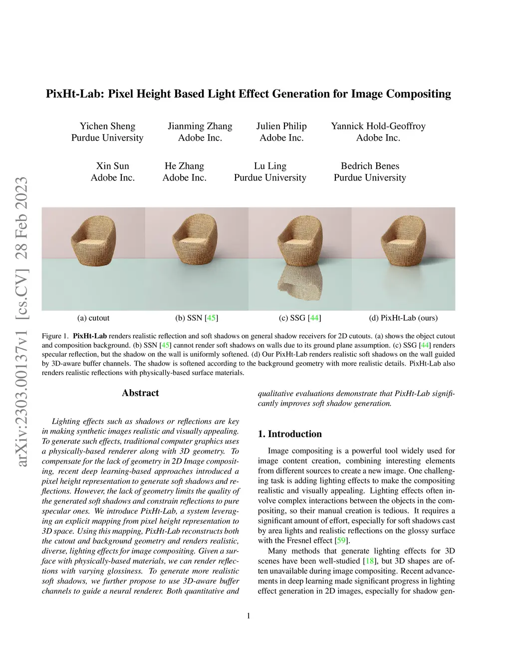 Lighting effects such as shadows or reflections are key in making synthetic images realistic and visually appealing. To generate such effects, traditional computer graphics uses a physically-based renderer along with 3D geometry. To compensate for the lack of geometry in 2D Image compositing, recent deep learning-based approaches introduced a pixel height representation to generate soft shadows and reflections. However, the lack of geometry limits the quality of the generated soft shadows and constrain reflections to pure specular ones. We introduce PixHt-Lab, a system leveraging an explicit mapping from pixel height representation to 3D space. Using this mapping, PixHt-Lab reconstructs both the cutout and background geometry and renders realistic, diverse, lighting effects for image compositing. Given a surface with physically-based materials, we can render reflections with varying glossiness. To generate more realistic soft shadows, we further propose to use 3D-aware buffer channels to guide a neural renderer. Both quantitative and qualitative evaluations demonstrate that PixHt-Lab significantly improves soft shadow generation.