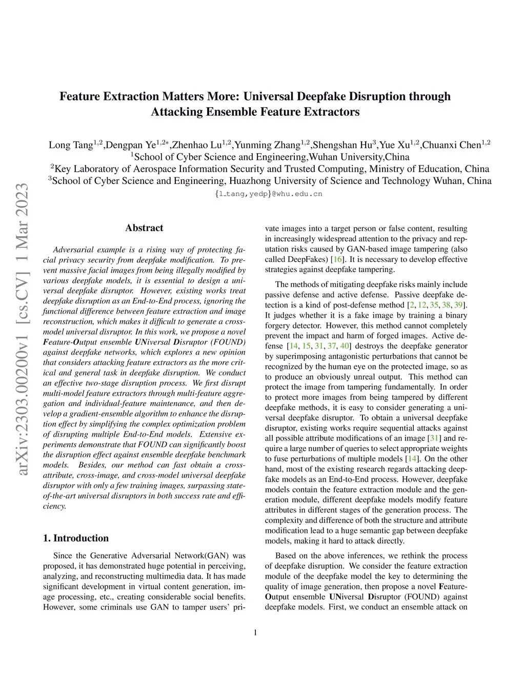 Adversarial example is a rising way of protecting facial privacy security from deepfake modification. To prevent massive facial images from being illegally modified by various deepfake models, it is essential to design a universal deepfake disruptor. However, existing works treat deepfake disruption as an End-to-End process, ignoring the functional difference between feature extraction and image reconstruction, which makes it difficult to generate a cross-model universal disruptor. In this work, we propose a novel Feature-Output ensemble UNiversal Disruptor (FOUND) against deepfake networks, which explores a new opinion that considers attacking feature extractors as the more critical and general task in deepfake disruption. We conduct an effective two-stage disruption process. We first disrupt multi-model feature extractors through multi-feature aggregation and individual-feature maintenance, and then develop a gradient-ensemble algorithm to enhance the disruption effect by simplifying the complex optimization problem of disrupting multiple End-to-End models. Extensive experiments demonstrate that FOUND can significantly boost the disruption effect against ensemble deepfake benchmark models. Besides, our method can fast obtain a cross-attribute, cross-image, and cross-model universal deepfake disruptor with only a few training images, surpassing state-of-the-art universal disruptors in both success rate and efficiency.
