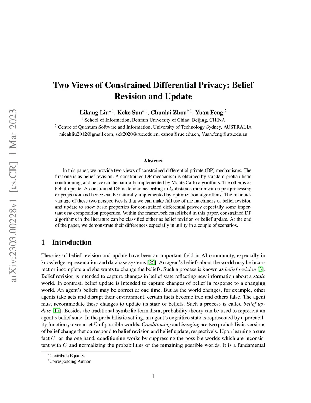 In this paper, we provide two views of constrained differential private (DP) mechanisms. The first one is as belief revision. A constrained DP mechanism is obtained by standard probabilistic conditioning, and hence can be naturally implemented by Monte Carlo algorithms. The other is as belief update. A constrained DP is defined according to l2-distance minimization postprocessing or projection and hence can be naturally implemented by optimization algorithms. The main advantage of these two perspectives is that we can make full use of the machinery of belief revision and update to show basic properties for constrained differential privacy especially some important new composition properties. Within the framework established in this paper, constrained DP algorithms in the literature can be classified either as belief revision or belief update. At the end of the paper, we demonstrate their differences especially in utility in a couple of scenarios.