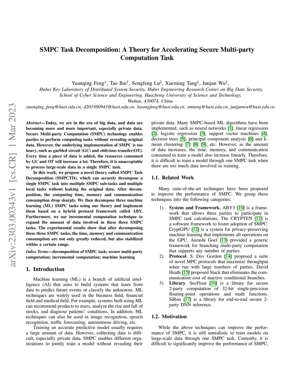 Today, we are in the era of big data, and data are becoming more and more important, especially private data. Secure Multi-party Computation (SMPC) technology enables parties to perform computing tasks without revealing original data. However, the underlying implementation of SMPC is too heavy, such as garbled circuit (GC) and oblivious transfer(OT). Every time a piece of data is added, the resources consumed by GC and OT will increase a lot. Therefore, it is unacceptable to process large-scale data in a single SMPC task. In this work, we propose a novel theory called SMPC Task Decomposition (SMPCTD), which can securely decompose a single SMPC task into multiple SMPC sub-tasks and multiple local tasks without leaking the original data. After decomposition, the computing time, memory and communication consumption drop sharply. We then decompose three machine learning (ML) SMPC tasks using our theory and implement them based on a hybrid protocol framework called ABY. Furthermore, we use incremental computation technique to expand the amount of data involved in these three SMPC tasks. The experimental results show that after decomposing these three SMPC tasks, the time, memory and communication consumption are not only greatly reduced, but also stabilized within a certain range.
