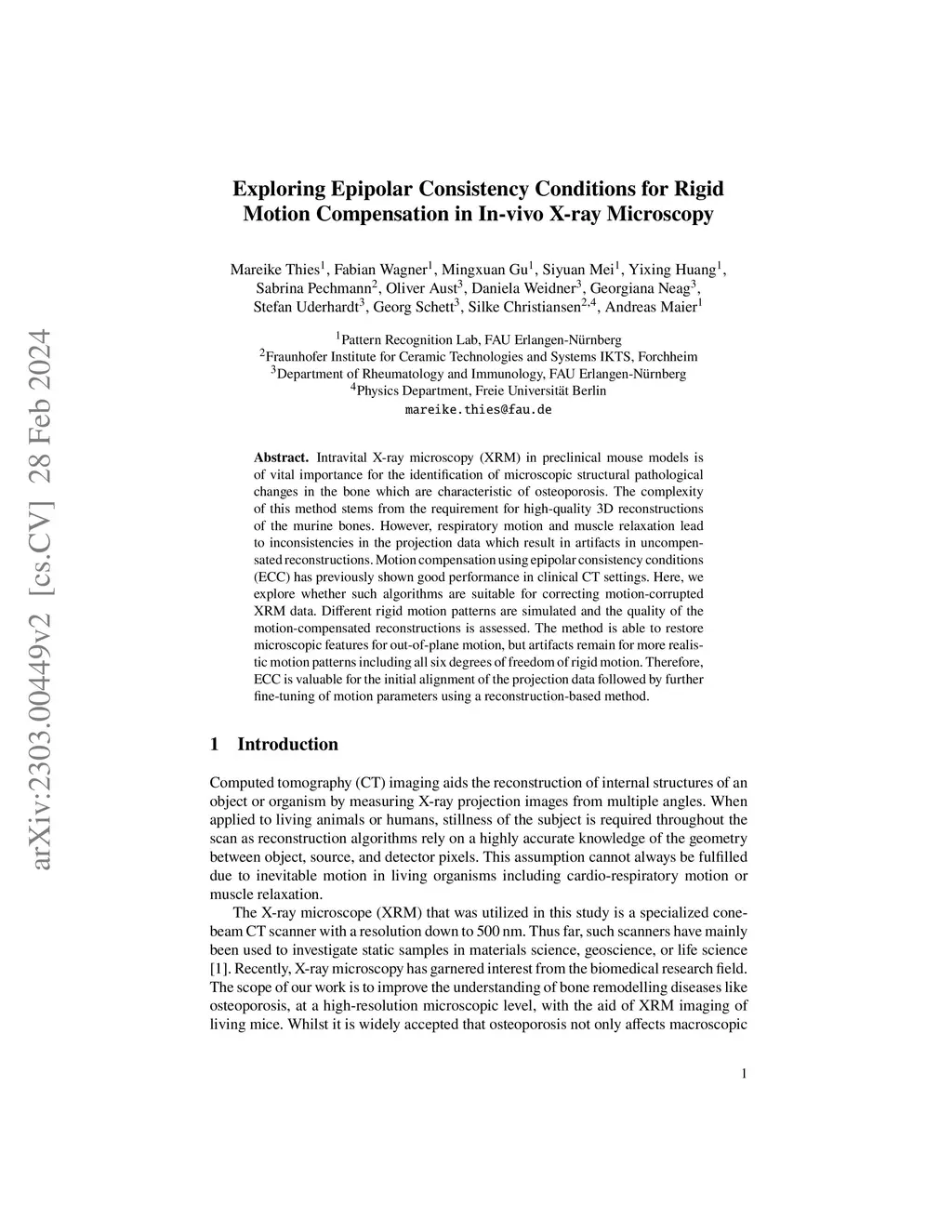 Intravital X-ray microscopy (XRM) in preclinical mouse models is of vital importance for the identification of microscopic structural pathological changes in the bone which are characteristic of osteoporosis. The complexity of this method stems from the requirement for high-quality 3D reconstructions of the murine bones. However, respiratory motion and muscle relaxation lead to inconsistencies in the projection data which result in artifacts in uncompensated reconstructions. Motion compensation using epipolar consistency conditions (ECC) has previously shown good performance in clinical CT settings. Here, we explore whether such algorithms are suitable for correcting motion-corrupted XRM data. Different rigid motion patterns are simulated and the quality of the motion-compensated reconstructions is assessed. The method is able to restore microscopic features for out-of-plane motion, but artifacts remain for more realistic motion patterns including all six degrees of freedom of rigid motion. Therefore, ECC is valuable for the initial alignment of the projection data followed by further fine-tuning of motion parameters using a reconstruction-based method.