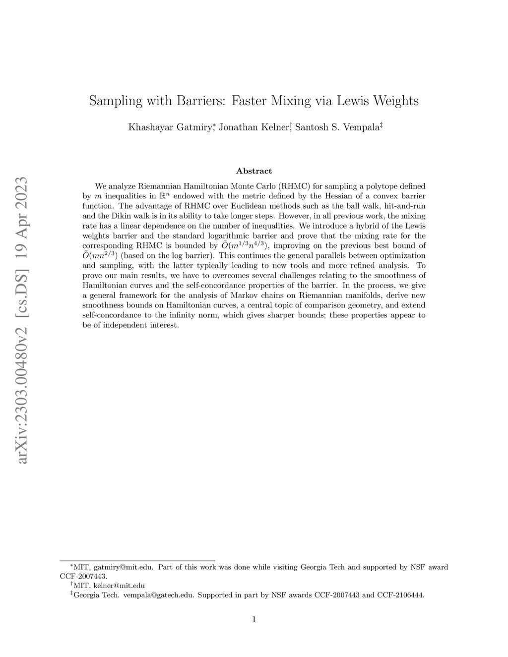 We analyze Riemannian Hamiltonian Monte Carlo (RHMC) for sampling a polytope defined by inequalities in endowed with the metric defined by the Hessian of a convex barrier function. The advantage of RHMC over Euclidean methods such as the ball walk, hit-and-run and the Dikin walk is in its ability to take longer steps. However, in all previous work, the mixing rate has a linear dependence on the number of inequalities. We introduce a hybrid of the Lewis weights barrier and the standard logarithmic barrier and prove that the mixing rate for the corresponding RHMC is bounded by , improving on the previous best bound of (based on the log barrier). This continues the general parallels between optimization and sampling, with the latter typically leading to new tools and more refined analysis. To prove our main results, we have to overcomes several challenges relating to the smoothness of Hamiltonian curves and the self-concordance properties of the barrier. In the process, we give a general framework for the analysis of Markov chains on Riemannian manifolds, derive new smoothness bounds on Hamiltonian curves, a central topic of comparison geometry, and extend self-concordance to the infinity norm, which gives sharper bounds; these properties appear to be of independent interest.