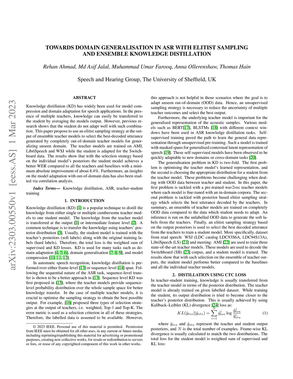 Knowledge distillation has widely been used for model compression and domain adaptation for speech applications. In the presence of multiple teachers, knowledge can easily be transferred to the student by averaging the models output. However, previous research shows that the student do not adapt well with such combination. This paper propose to use an elitist sampling strategy at the output of ensemble teacher models to select the best-decoded utterance generated by completely out-of-domain teacher models for generalizing unseen domain. The teacher models are trained on AMI, LibriSpeech and WSJ while the student is adapted for the Switchboard data. The results show that with the selection strategy based on the individual models posteriors the student model achieves a better WER compared to all the teachers and baselines with a minimum absolute improvement of about 8.4 percent. Furthermore, an insights on the model adaptation with out-of-domain data has also been studied via correlation analysis.