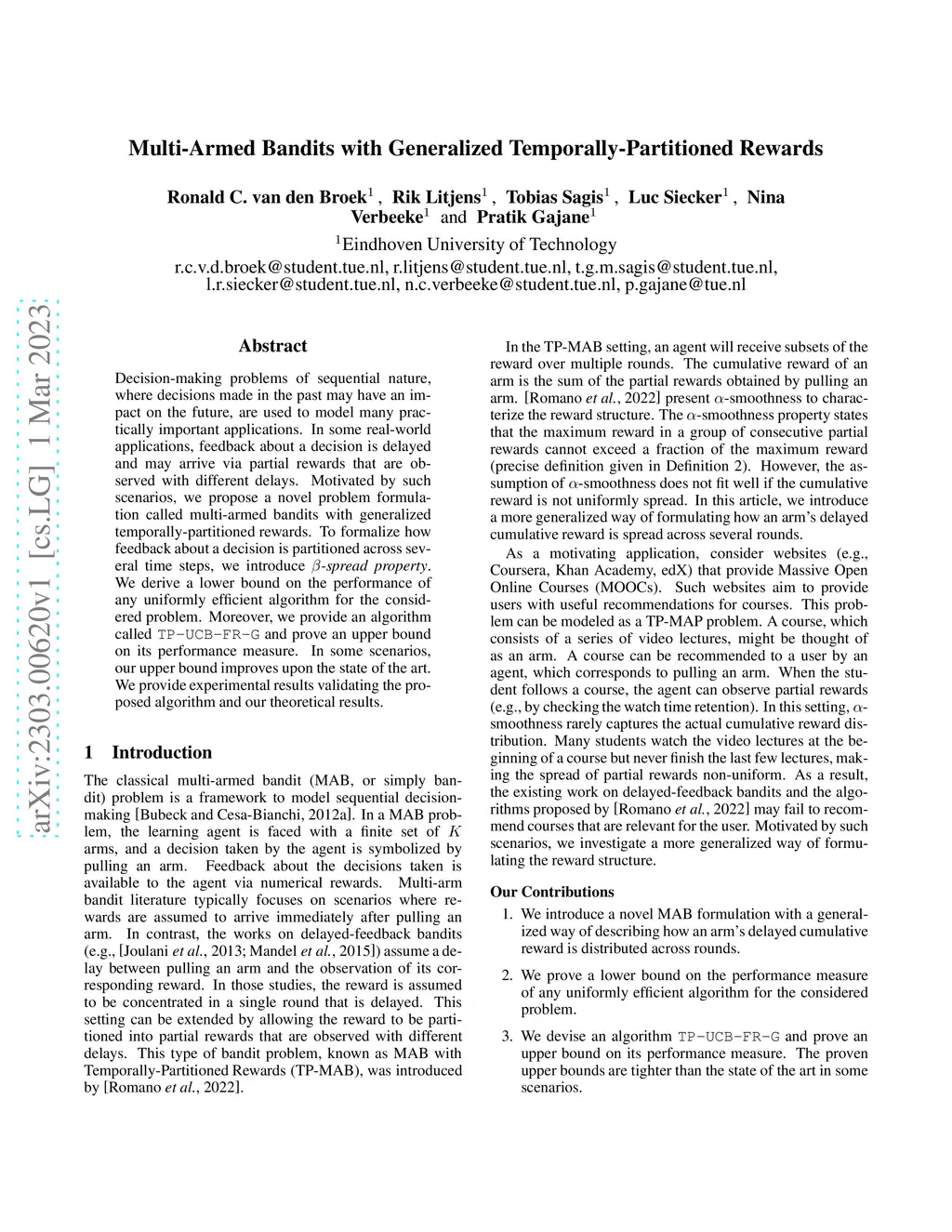 Decision-making problems of sequential nature, where decisions made in the past may have an impact on the future, are used to model many practically important applications. In some real-world applications, feedback about a decision is delayed and may arrive via partial rewards that are observed with different delays. Motivated by such scenarios, we propose a novel problem formulation called multi-armed bandits with generalized temporally-partitioned rewards. To formalize how feedback about a decision is partitioned across several time steps, we introduce -spread property. We derive a lower bound on the performance of any uniformly efficient algorithm for the considered problem. Moreover, we provide an algorithm called TP-UCB-FR-G and prove an upper bound on its performance measure. In some scenarios, our upper bound improves upon the state of the art. We provide experimental results validating the proposed algorithm and our theoretical results.