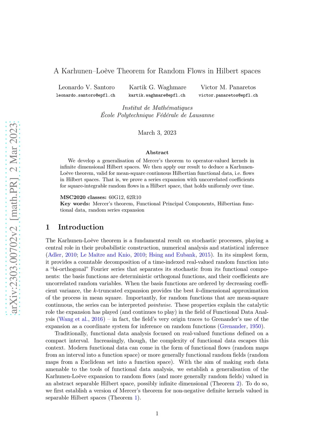 We develop a generalisation of Mercer's theorem to operator-valued kernels in infinite dimensional Hilbert spaces. We then apply our result to deduce a Karhunen-Lo\`eve theorem, valid for mean-square continuous Hilbertian functional data, i.e. flows in Hilbert spaces. That is, we prove a series expansion with uncorrelated coefficients for square-integrable random flows in a Hilbert space, that holds uniformly over time.