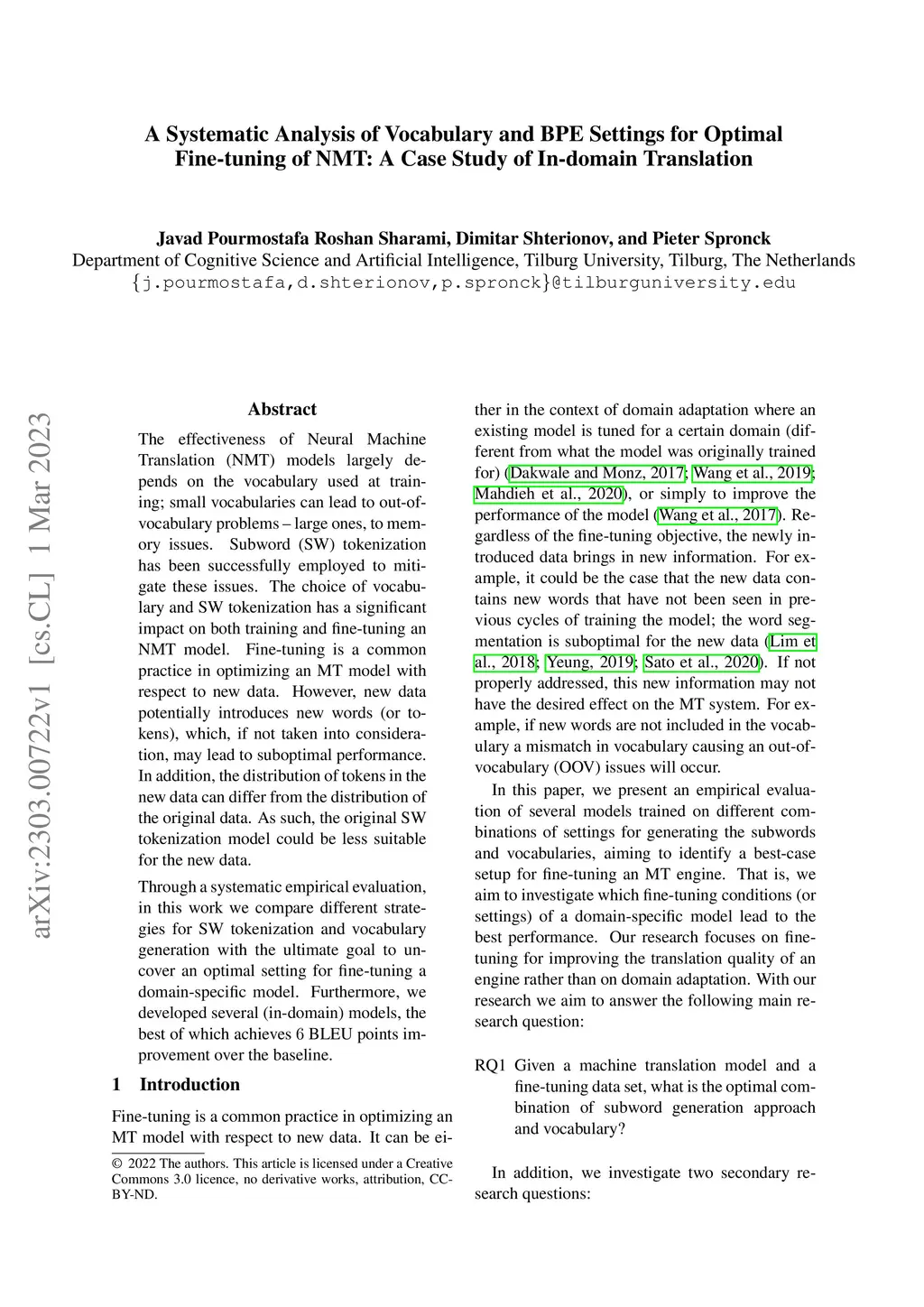 The effectiveness of Neural Machine Translation (NMT) models largely depends on the vocabulary used at training; small vocabularies can lead to out-of-vocabulary problems -- large ones, to memory issues. Subword (SW) tokenization has been successfully employed to mitigate these issues. The choice of vocabulary and SW tokenization has a significant impact on both training and fine-tuning an NMT model. Fine-tuning is a common practice in optimizing an MT model with respect to new data. However, new data potentially introduces new words (or tokens), which, if not taken into consideration, may lead to suboptimal performance. In addition, the distribution of tokens in the new data can differ from the distribution of the original data. As such, the original SW tokenization model could be less suitable for the new data. Through a systematic empirical evaluation, in this work we compare different strategies for SW tokenization and vocabulary generation with the ultimate goal to uncover an optimal setting for fine-tuning a domain-specific model. Furthermore, we developed several (in-domain) models, the best of which achieves 6 BLEU points improvement over the baseline.