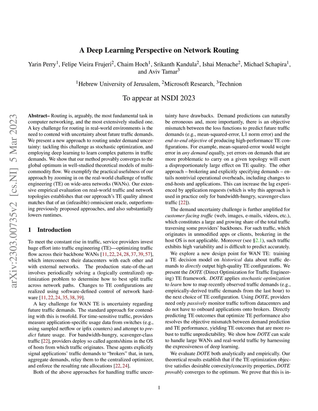 Routing is, arguably, the most fundamental task in computer networking, and the most extensively studied one. A key challenge for routing in real-world environments is the need to contend with uncertainty about future traffic demands. We present a new approach to routing under demand uncertainty: tackling this challenge as stochastic optimization, and employing deep learning to learn complex patterns in traffic demands. We show that our method provably converges to the global optimum in well-studied theoretical models of multicommodity flow. We exemplify the practical usefulness of our approach by zooming in on the real-world challenge of traffic engineering (TE) on wide-area networks (WANs). Our extensive empirical evaluation on real-world traffic and network topologies establishes that our approach's TE quality almost matches that of an (infeasible) omniscient oracle, outperforming previously proposed approaches, and also substantially lowers runtimes.