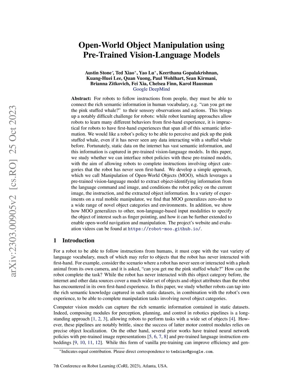 For robots to follow instructions from people, they must be able to connect the rich semantic information in human vocabulary, e.g. "can you get me the pink stuffed whale?" to their sensory observations and actions. This brings up a notably difficult challenge for robots: while robot learning approaches allow robots to learn many different behaviors from first-hand experience, it is impractical for robots to have first-hand experiences that span all of this semantic information. We would like a robot's policy to be able to perceive and pick up the pink stuffed whale, even if it has never seen any data interacting with a stuffed whale before. Fortunately, static data on the internet has vast semantic information, and this information is captured in pre-trained vision-language models. In this paper, we study whether we can interface robot policies with these pre-trained models, with the aim of allowing robots to complete instructions involving object categories that the robot has never seen first-hand. We develop a simple approach, which we call Manipulation of Open-World Objects (MOO), which leverages a pre-trained vision-language model to extract object-identifying information from the language command and image, and conditions the robot policy on the current image, the instruction, and the extracted object information. In a variety of experiments on a real mobile manipulator, we find that MOO generalizes zero-shot to a wide range of novel object categories and environments. In addition, we show how MOO generalizes to other, non-language-based input modalities to specify the object of interest such as finger pointing, and how it can be further extended to enable open-world navigation and manipulation. The project's website and evaluation videos can be found at https://robot-moo.github.io/