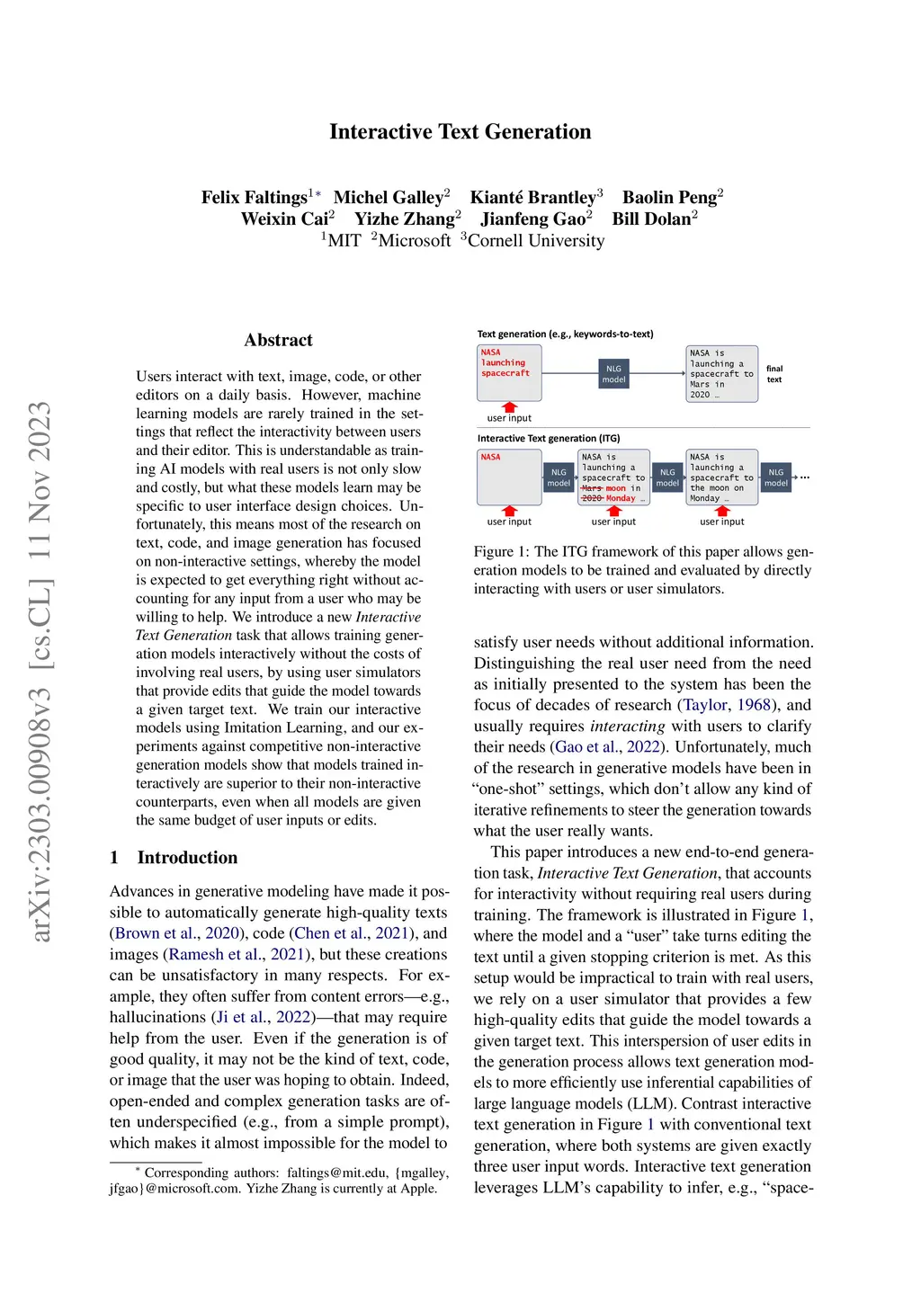 Users interact with text, image, code, or other editors on a daily basis. However, machine learning models are rarely trained in the settings that reflect the interactivity between users and their editor. This is understandable as training AI models with real users is not only slow and costly, but what these models learn may be specific to user interface design choices. Unfortunately, this means most of the research on text, code, and image generation has focused on non-interactive settings, whereby the model is expected to get everything right without accounting for any input from a user who may be willing to help. We introduce a new Interactive Text Generation task that allows training generation models interactively without the costs of involving real users, by using user simulators that provide edits that guide the model towards a given target text. We train our interactive models using Imitation Learning, and our experiments against competitive non-interactive generation models show that models trained interactively are superior to their non-interactive counterparts, even when all models are given the same budget of user inputs or edits.