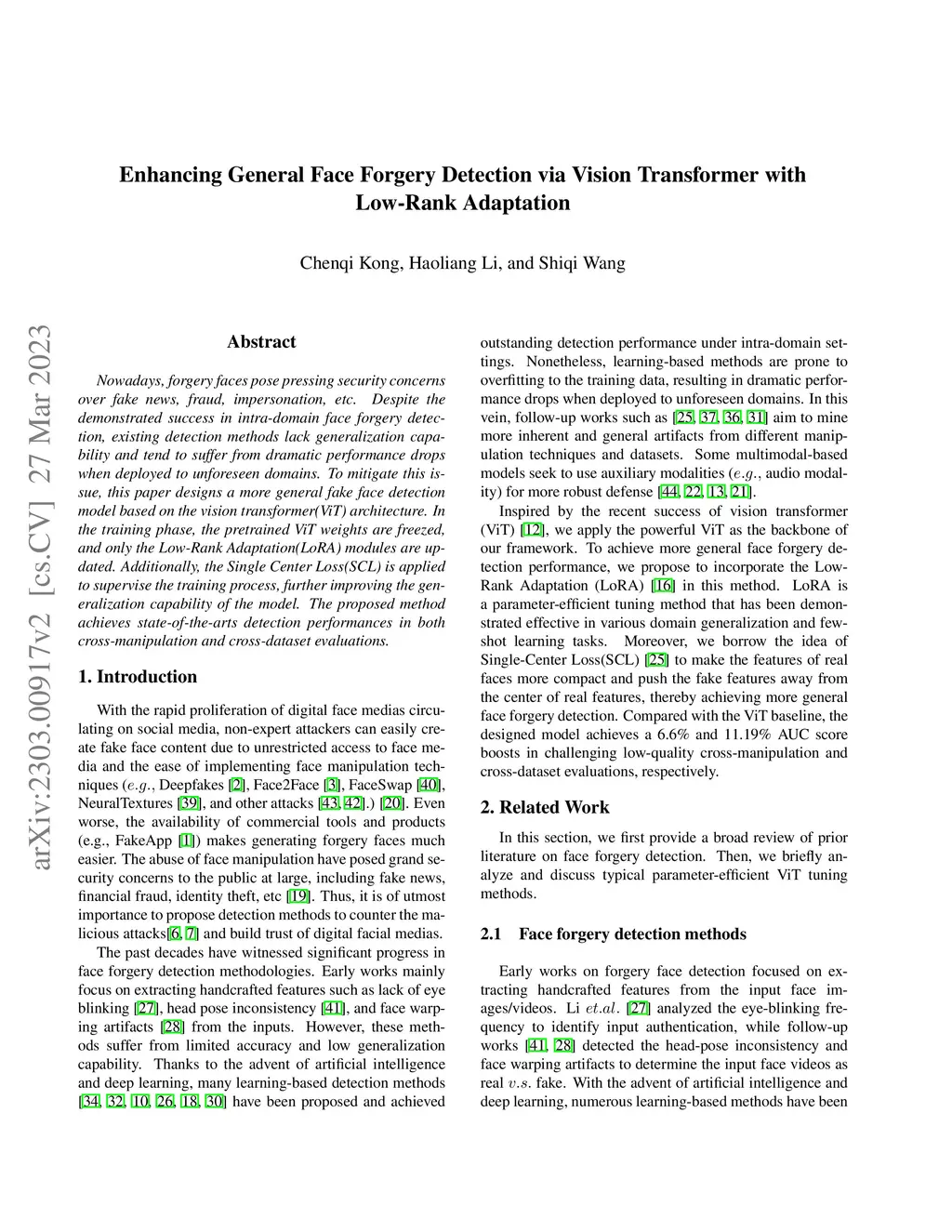 Nowadays, forgery faces pose pressing security concerns over fake news, fraud, impersonation, etc. Despite the demonstrated success in intra-domain face forgery detection, existing detection methods lack generalization capability and tend to suffer from dramatic performance drops when deployed to unforeseen domains. To mitigate this issue, this paper designs a more general fake face detection model based on the vision transformer(ViT) architecture. In the training phase, the pretrained ViT weights are freezed, and only the Low-Rank Adaptation(LoRA) modules are updated. Additionally, the Single Center Loss(SCL) is applied to supervise the training process, further improving the generalization capability of the model. The proposed method achieves state-of-the-arts detection performances in both cross-manipulation and cross-dataset evaluations.