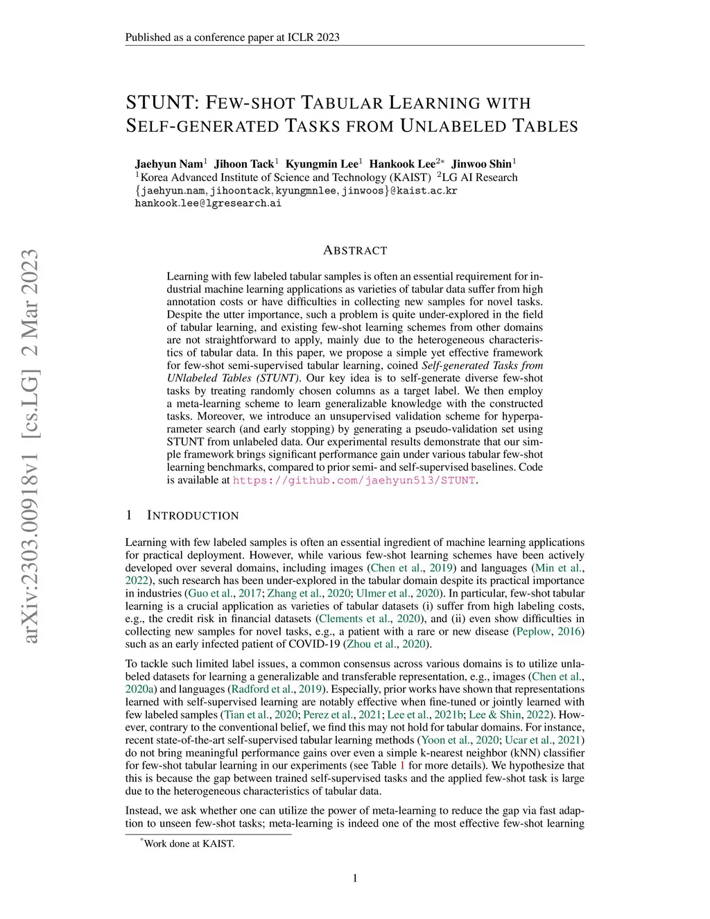 Learning with few labeled tabular samples is often an essential requirement for industrial machine learning applications as varieties of tabular data suffer from high annotation costs or have difficulties in collecting new samples for novel tasks. Despite the utter importance, such a problem is quite under-explored in the field of tabular learning, and existing few-shot learning schemes from other domains are not straightforward to apply, mainly due to the heterogeneous characteristics of tabular data. In this paper, we propose a simple yet effective framework for few-shot semi-supervised tabular learning, coined Self-generated Tasks from UNlabeled Tables (STUNT). Our key idea is to self-generate diverse few-shot tasks by treating randomly chosen columns as a target label. We then employ a meta-learning scheme to learn generalizable knowledge with the constructed tasks. Moreover, we introduce an unsupervised validation scheme for hyperparameter search (and early stopping) by generating a pseudo-validation set using STUNT from unlabeled data. Our experimental results demonstrate that our simple framework brings significant performance gain under various tabular few-shot learning benchmarks, compared to prior semi- and self-supervised baselines. Code is available at https://github.com/jaehyun513/STUNT.