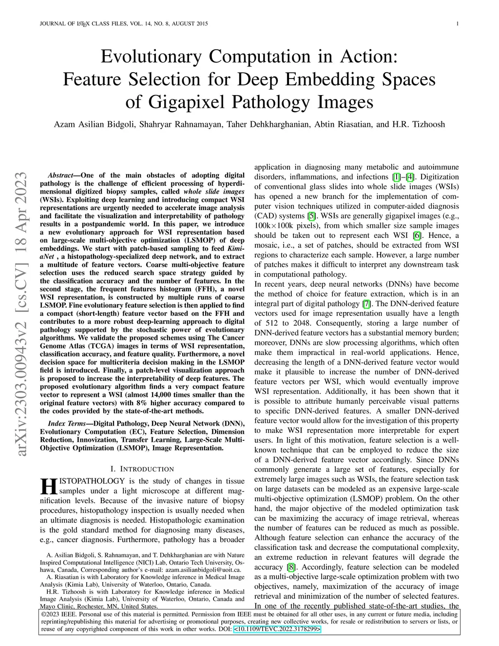 One of the main obstacles of adopting digital pathology is the challenge of efficient processing of hyperdimensional digitized biopsy samples, called whole slide images (WSIs). Exploiting deep learning and introducing compact WSI representations are urgently needed to accelerate image analysis and facilitate the visualization and interpretability of pathology results in a postpandemic world. In this paper, we introduce a new evolutionary approach for WSI representation based on large-scale multi-objective optimization (LSMOP) of deep embeddings. We start with patch-based sampling to feed KimiaNet , a histopathology-specialized deep network, and to extract a multitude of feature vectors. Coarse multi-objective feature selection uses the reduced search space strategy guided by the classification accuracy and the number of features. In the second stage, the frequent features histogram (FFH), a novel WSI representation, is constructed by multiple runs of coarse LSMOP. Fine evolutionary feature selection is then applied to find a compact (short-length) feature vector based on the FFH and contributes to a more robust deep-learning approach to digital pathology supported by the stochastic power of evolutionary algorithms. We validate the proposed schemes using The Cancer Genome Atlas (TCGA) images in terms of WSI representation, classification accuracy, and feature quality. Furthermore, a novel decision space for multicriteria decision making in the LSMOP field is introduced. Finally, a patch-level visualization approach is proposed to increase the interpretability of deep features. The proposed evolutionary algorithm finds a very compact feature vector to represent a WSI (almost 14,000 times smaller than the original feature vectors) with 8% higher accuracy compared to the codes provided by the state-of-the-art methods.