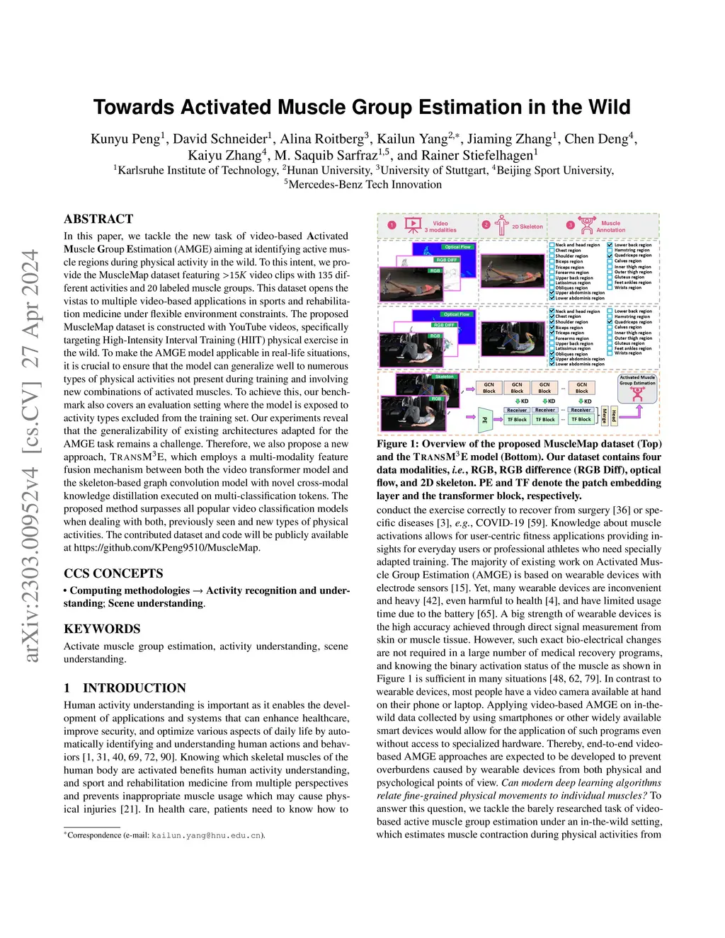 In this paper, we tackle the new task of video-based Activated Muscle Group Estimation (AMGE) aiming at identifying active muscle regions during physical activity in the wild. To this intent, we provide the MuscleMap dataset featuring >15K video clips with 135 different activities and 20 labeled muscle groups. This dataset opens the vistas to multiple video-based applications in sports and rehabilitation medicine under flexible environment constraints. The proposed MuscleMap dataset is constructed with YouTube videos, specifically targeting High-Intensity Interval Training (HIIT) physical exercise in the wild. To make the AMGE model applicable in real-life situations, it is crucial to ensure that the model can generalize well to numerous types of physical activities not present during training and involving new combinations of activated muscles. To achieve this, our benchmark also covers an evaluation setting where the model is exposed to activity types excluded from the training set. Our experiments reveal that the generalizability of existing architectures adapted for the AMGE task remains a challenge. Therefore, we also propose a new approach, TransM3E, which employs a multi-modality feature fusion mechanism between both the video transformer model and the skeleton-based graph convolution model with novel cross-modal knowledge distillation executed on multi-classification tokens. The proposed method surpasses all popular video classification models when dealing with both, previously seen and new types of physical activities. The contributed dataset and code will be publicly available at https://github.com/KPeng9510/MuscleMap.