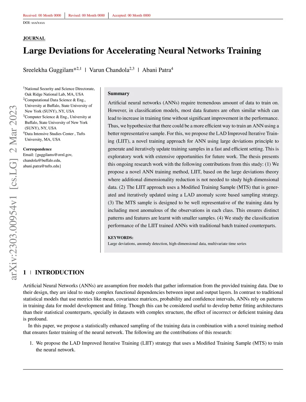 Artificial neural networks (ANNs) require tremendous amount of data to train on. However, in classification models, most data features are often similar which can lead to increase in training time without significant improvement in the performance. Thus, we hypothesize that there could be a more efficient way to train an ANN using a better representative sample. For this, we propose the LAD Improved Iterative Training (LIIT), a novel training approach for ANN using large deviations principle to generate and iteratively update training samples in a fast and efficient setting. This is exploratory work with extensive opportunities for future work. The thesis presents this ongoing research work with the following contributions from this study: (1) We propose a novel ANN training method, LIIT, based on the large deviations theory where additional dimensionality reduction is not needed to study high dimensional data. (2) The LIIT approach uses a Modified Training Sample (MTS) that is generated and iteratively updated using a LAD anomaly score based sampling strategy. (3) The MTS sample is designed to be well representative of the training data by including most anomalous of the observations in each class. This ensures distinct patterns and features are learnt with smaller samples. (4) We study the classification performance of the LIIT trained ANNs with traditional batch trained counterparts.