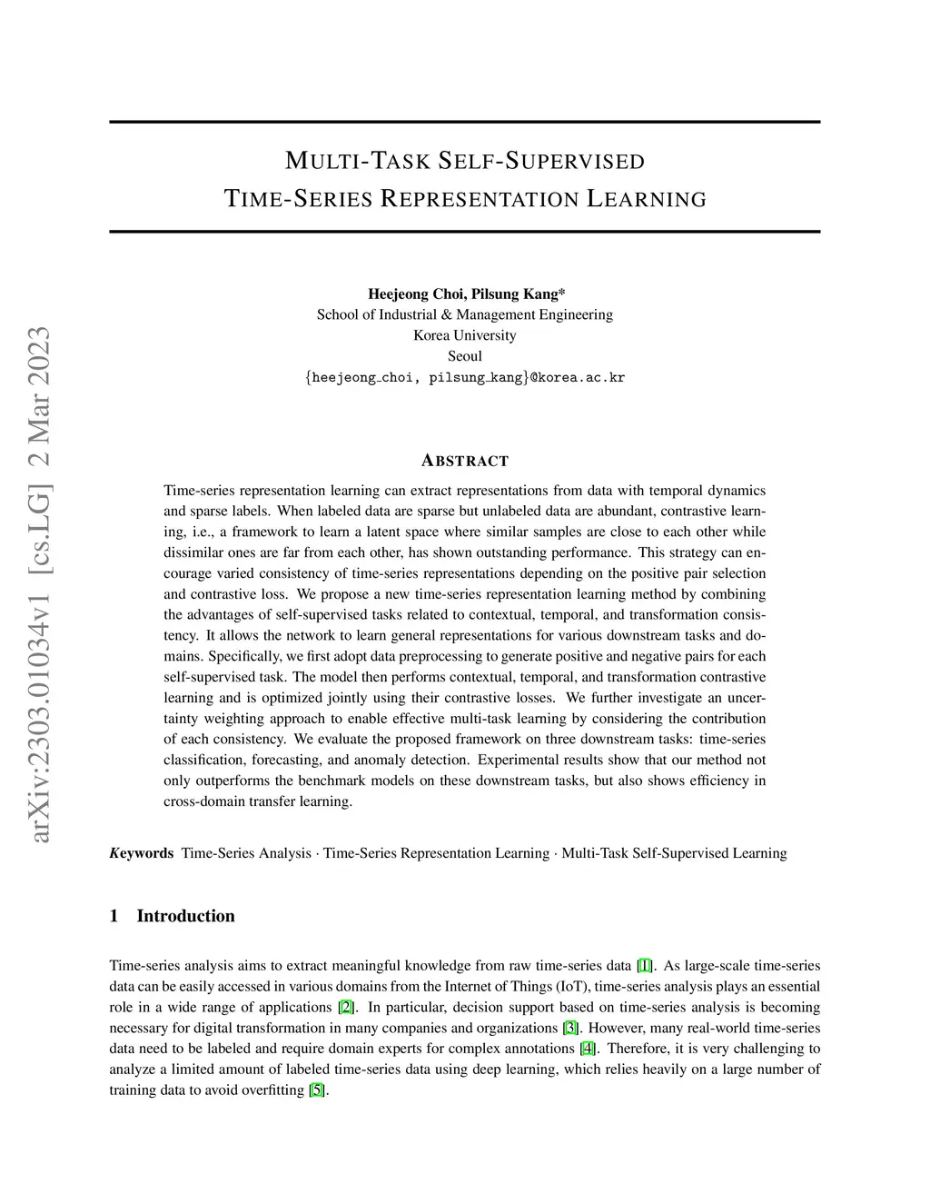 Time-series representation learning can extract representations from data with temporal dynamics and sparse labels. When labeled data are sparse but unlabeled data are abundant, contrastive learning, i.e., a framework to learn a latent space where similar samples are close to each other while dissimilar ones are far from each other, has shown outstanding performance. This strategy can encourage varied consistency of time-series representations depending on the positive pair selection and contrastive loss. We propose a new time-series representation learning method by combining the advantages of self-supervised tasks related to contextual, temporal, and transformation consistency. It allows the network to learn general representations for various downstream tasks and domains. Specifically, we first adopt data preprocessing to generate positive and negative pairs for each self-supervised task. The model then performs contextual, temporal, and transformation contrastive learning and is optimized jointly using their contrastive losses. We further investigate an uncertainty weighting approach to enable effective multi-task learning by considering the contribution of each consistency. We evaluate the proposed framework on three downstream tasks: time-series classification, forecasting, and anomaly detection. Experimental results show that our method not only outperforms the benchmark models on these downstream tasks, but also shows efficiency in cross-domain transfer learning.