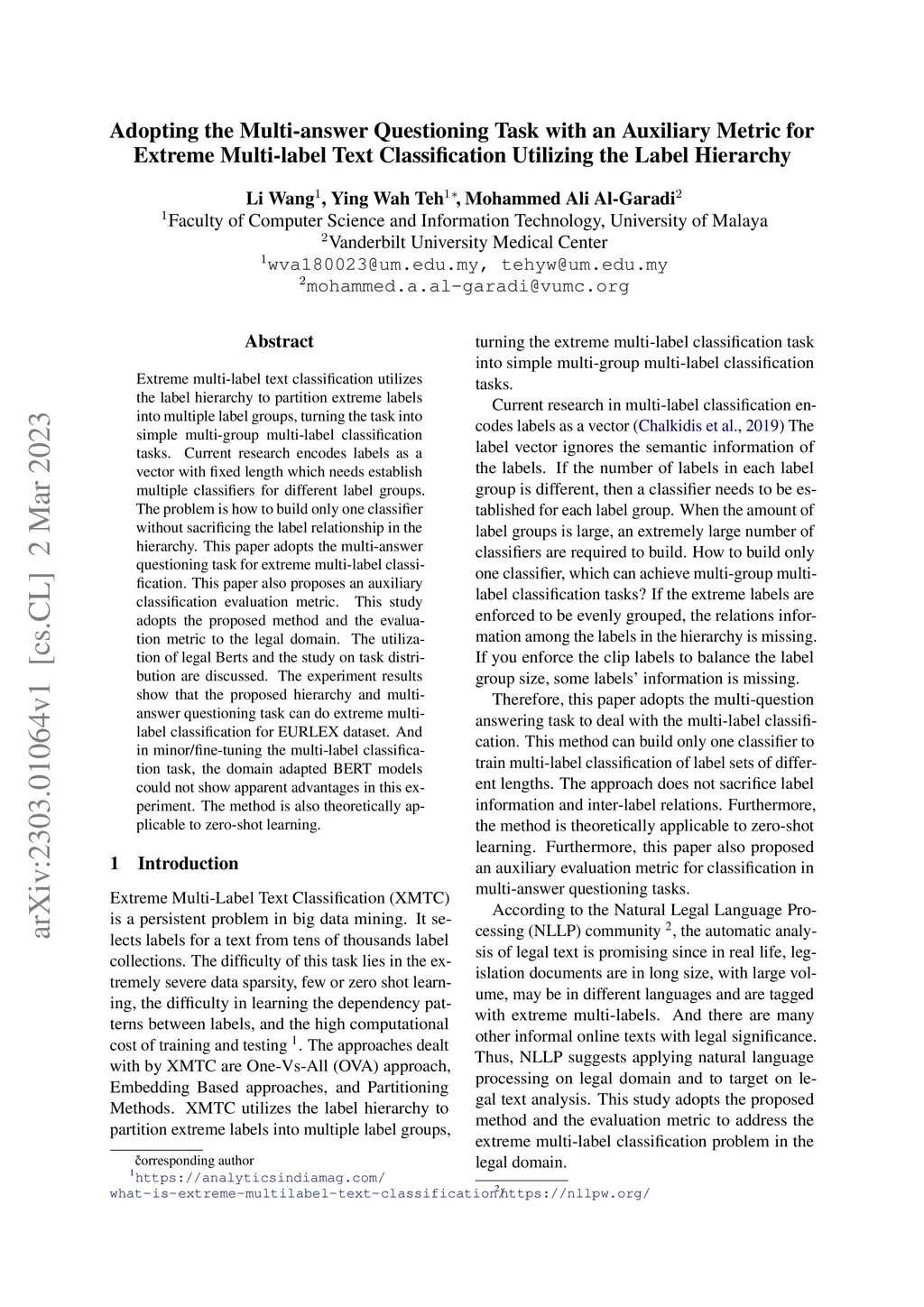 Extreme multi-label text classification utilizes the label hierarchy to partition extreme labels into multiple label groups, turning the task into simple multi-group multi-label classification tasks. Current research encodes labels as a vector with fixed length which needs establish multiple classifiers for different label groups. The problem is how to build only one classifier without sacrificing the label relationship in the hierarchy. This paper adopts the multi-answer questioning task for extreme multi-label classification. This paper also proposes an auxiliary classification evaluation metric. This study adopts the proposed method and the evaluation metric to the legal domain. The utilization of legal Berts and the study on task distribution are discussed. The experiment results show that the proposed hierarchy and multi-answer questioning task can do extreme multi-label classification for EURLEX dataset. And in minor/fine-tuning the multi-label classification task, the domain adapted BERT models could not show apparent advantages in this experiment. The method is also theoretically applicable to zero-shot learning.