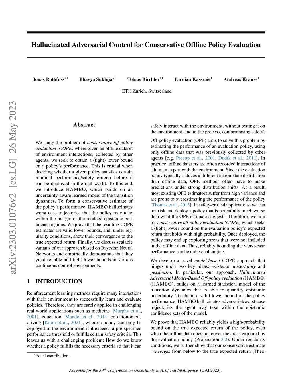 We study the problem of conservative off-policy evaluation (COPE) where given an offline dataset of environment interactions, collected by other agents, we seek to obtain a (tight) lower bound on a policy's performance. This is crucial when deciding whether a given policy satisfies certain minimal performance/safety criteria before it can be deployed in the real world. To this end, we introduce HAMBO, which builds on an uncertainty-aware learned model of the transition dynamics. To form a conservative estimate of the policy's performance, HAMBO hallucinates worst-case trajectories that the policy may take, within the margin of the models' epistemic confidence regions. We prove that the resulting COPE estimates are valid lower bounds, and, under regularity conditions, show their convergence to the true expected return. Finally, we discuss scalable variants of our approach based on Bayesian Neural Networks and empirically demonstrate that they yield reliable and tight lower bounds in various continuous control environments.