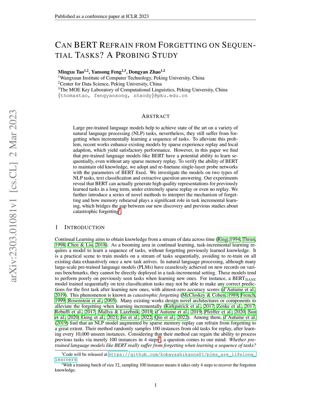 Can BERT Refrain from Forgetting on Sequential Tasks? A Probing Study