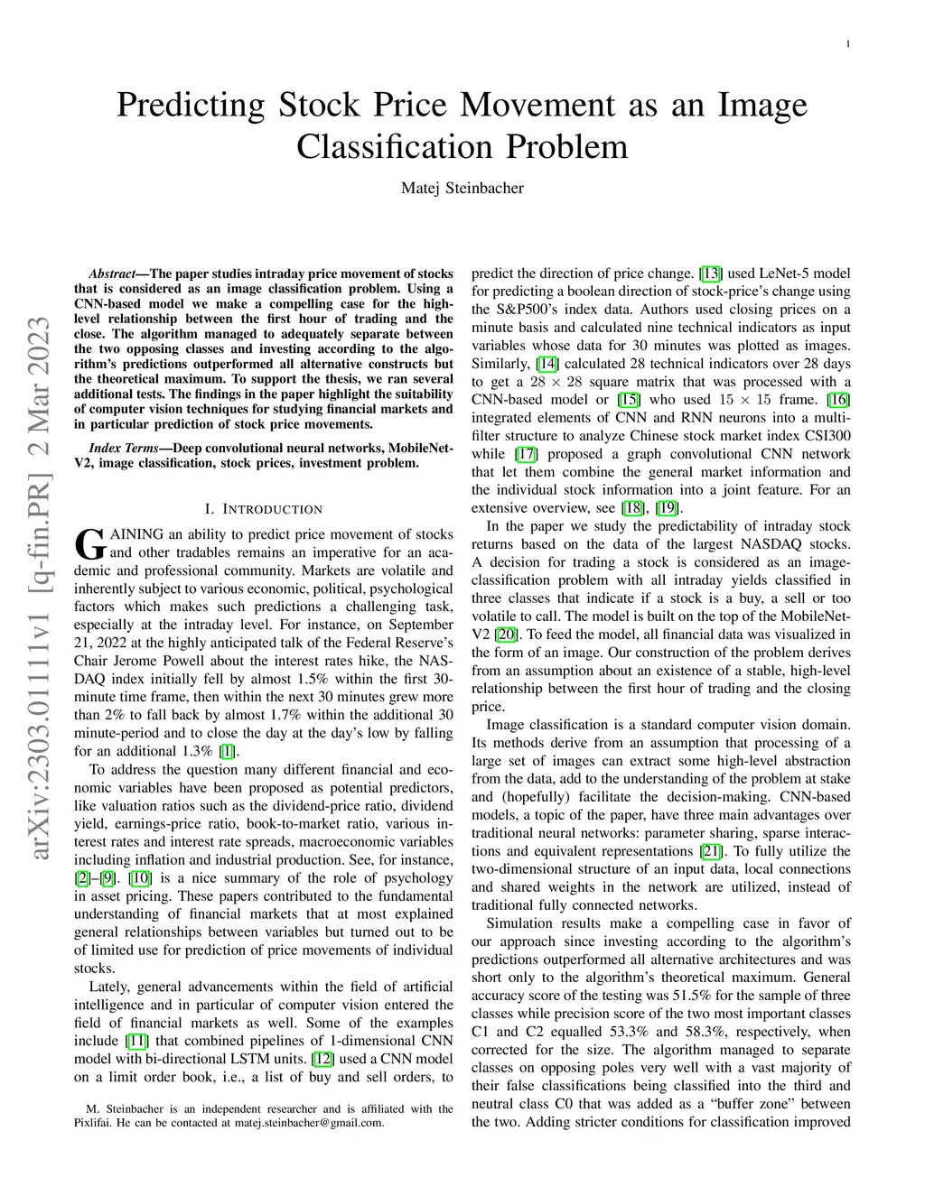 The paper studies intraday price movement of stocks that is considered as an image classification problem. Using a CNN-based model we make a compelling case for the high-level relationship between the first hour of trading and the close. The algorithm managed to adequately separate between the two opposing classes and investing according to the algorithm's predictions outperformed all alternative constructs but the theoretical maximum. To support the thesis, we ran several additional tests. The findings in the paper highlight the suitability of computer vision techniques for studying financial markets and in particular prediction of stock price movements.