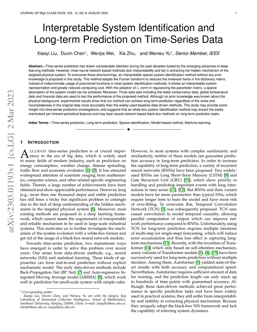 Time-series prediction has drawn considerable attention during the past decades fueled by the emerging advances of deep learning methods. However, most neural network based methods lack interpretability and fail in extracting the hidden mechanism of the targeted physical system. To overcome these shortcomings, an interpretable sparse system identification method without any prior knowledge is proposed in this study. This method adopts the Fourier transform to reduces the irrelevant items in the dictionary matrix, instead of indiscriminate usage of polynomial functions in most system identification methods. It shows an interpretable system representation and greatly reduces computing cost. With the adoption of norm in regularizing the parameter matrix, a sparse description of the system model can be achieved. Moreover, Three data sets including the water conservancy data, global temperature data and financial data are used to test the performance of the proposed method. Although no prior knowledge was known about the physical background, experimental results show that our method can achieve long-term prediction regardless of the noise and incompleteness in the original data more accurately than the widely-used baseline data-driven methods. This study may provide some insight into time-series prediction investigations, and suggests that an white-box system identification method may extract the easily overlooked yet inherent periodical features and may beat neural-network based black-box methods on long-term prediction tasks.