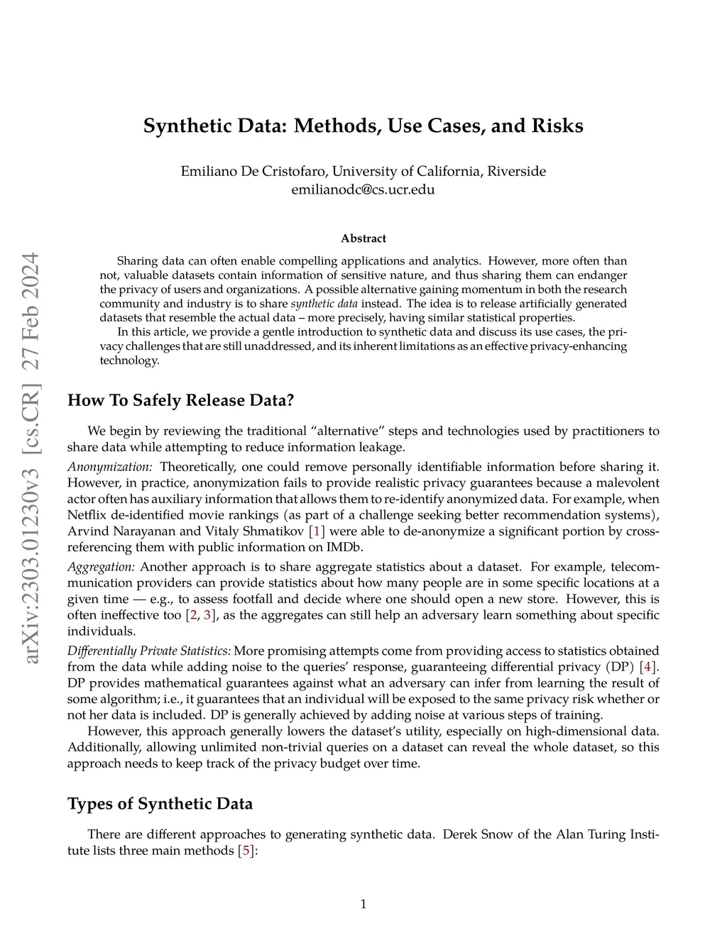 Synthetic Data: Methods, Use Cases, and Risks