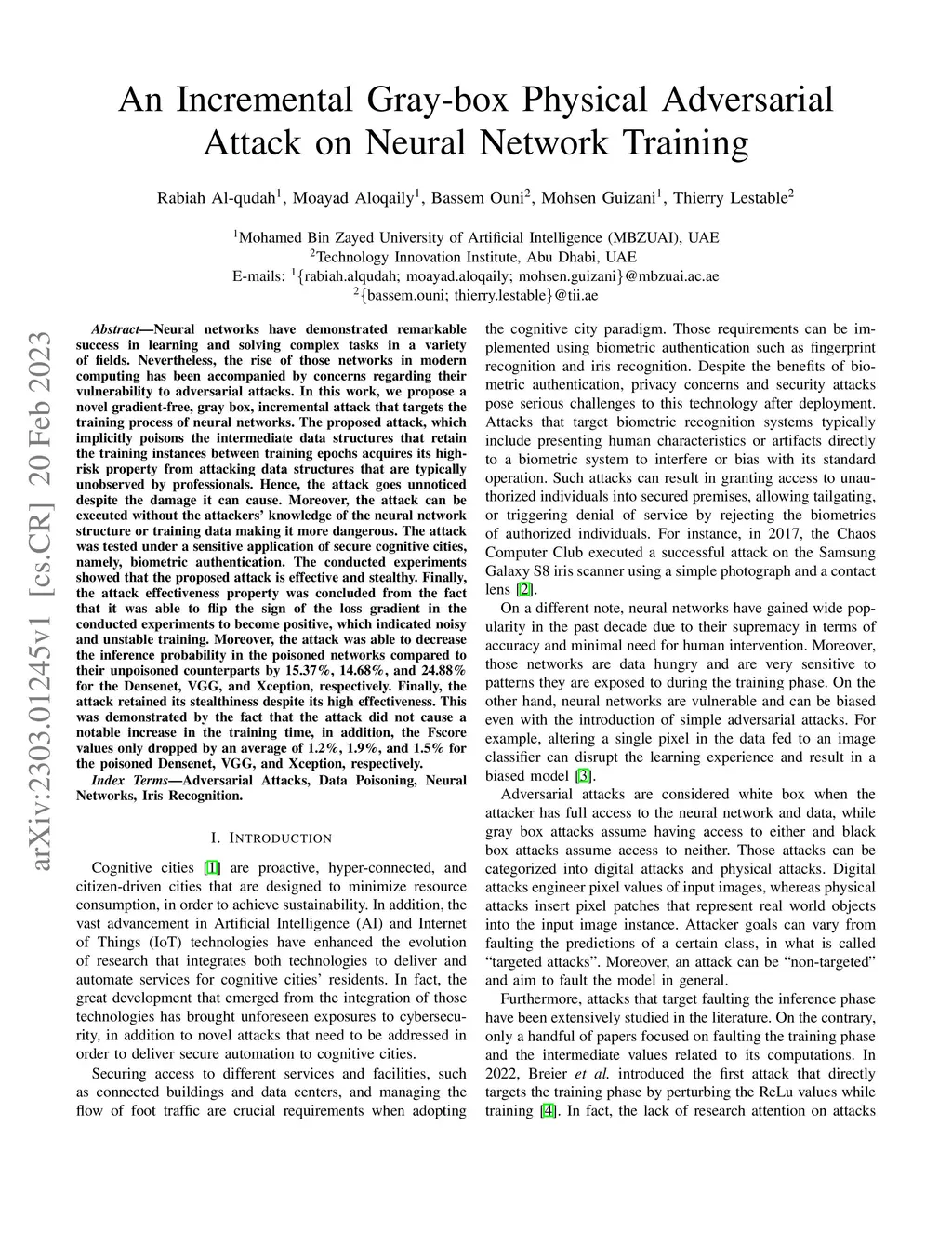 Neural networks have demonstrated remarkable success in learning and solving complex tasks in a variety of fields. Nevertheless, the rise of those networks in modern computing has been accompanied by concerns regarding their vulnerability to adversarial attacks. In this work, we propose a novel gradient-free, gray box, incremental attack that targets the training process of neural networks. The proposed attack, which implicitly poisons the intermediate data structures that retain the training instances between training epochs acquires its high-risk property from attacking data structures that are typically unobserved by professionals. Hence, the attack goes unnoticed despite the damage it can cause. Moreover, the attack can be executed without the attackers' knowledge of the neural network structure or training data making it more dangerous. The attack was tested under a sensitive application of secure cognitive cities, namely, biometric authentication. The conducted experiments showed that the proposed attack is effective and stealthy. Finally, the attack effectiveness property was concluded from the fact that it was able to flip the sign of the loss gradient in the conducted experiments to become positive, which indicated noisy and unstable training. Moreover, the attack was able to decrease the inference probability in the poisoned networks compared to their unpoisoned counterparts by 15.37%, 14.68%, and 24.88% for the Densenet, VGG, and Xception, respectively. Finally, the attack retained its stealthiness despite its high effectiveness. This was demonstrated by the fact that the attack did not cause a notable increase in the training time, in addition, the Fscore values only dropped by an average of 1.2%, 1.9%, and 1.5% for the poisoned Densenet, VGG, and Xception, respectively.
