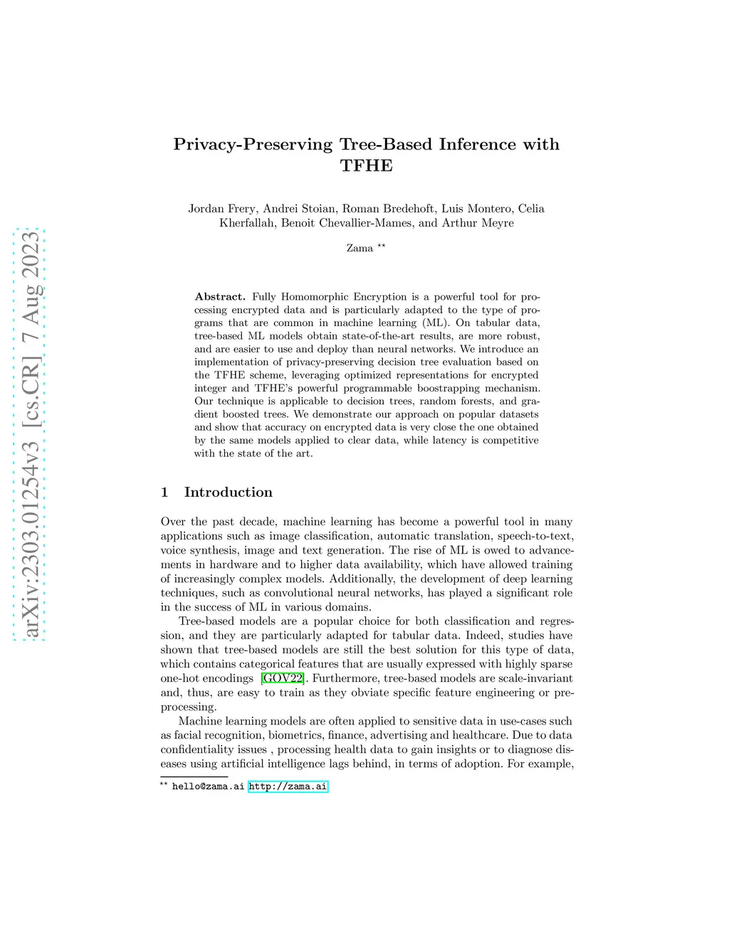 Privacy enhancing technologies (PETs) have been proposed as a way to protect the privacy of data while still allowing for data analysis. In this work, we focus on Fully Homomorphic Encryption (FHE), a powerful tool that allows for arbitrary computations to be performed on encrypted data. FHE has received lots of attention in the past few years and has reached realistic execution times and correctness. More precisely, we explain in this paper how we apply FHE to tree-based models and get state-of-the-art solutions over encrypted tabular data. We show that our method is applicable to a wide range of tree-based models, including decision trees, random forests, and gradient boosted trees, and has been implemented within the Concrete-ML library, which is open-source at https://github.com/zama-ai/concrete-ml. With a selected set of use-cases, we demonstrate that our FHE version is very close to the unprotected version in terms of accuracy.