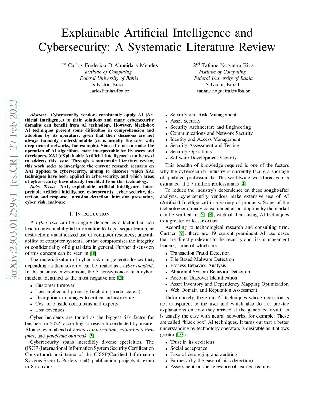 Cybersecurity vendors consistently apply AI (Artificial Intelligence) to their solutions and many cybersecurity domains can benefit from AI technology. However, black-box AI techniques present some difficulties in comprehension and adoption by its operators, given that their decisions are not always humanly understandable (as is usually the case with deep neural networks, for example). Since it aims to make the operation of AI algorithms more interpretable for its users and developers, XAI (eXplainable Artificial Intelligence) can be used to address this issue. Through a systematic literature review, this work seeks to investigate the current research scenario on XAI applied to cybersecurity, aiming to discover which XAI techniques have been applied in cybersecurity, and which areas of cybersecurity have already benefited from this technology.