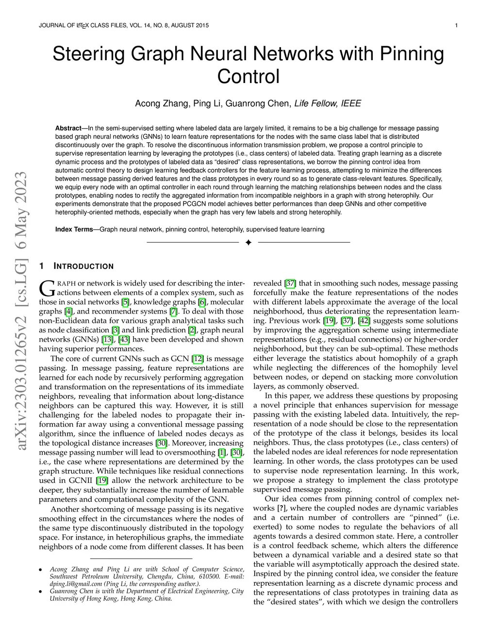 In the semi-supervised setting where labeled data are largely limited, it remains to be a big challenge for message passing based graph neural networks (GNNs) to learn feature representations for the nodes with the same class label that is distributed discontinuously over the graph. To resolve the discontinuous information transmission problem, we propose a control principle to supervise representation learning by leveraging the prototypes (i.e., class centers) of labeled data. Treating graph learning as a discrete dynamic process and the prototypes of labeled data as "desired" class representations, we borrow the pinning control idea from automatic control theory to design learning feedback controllers for the feature learning process, attempting to minimize the differences between message passing derived features and the class prototypes in every round so as to generate class-relevant features. Specifically, we equip every node with an optimal controller in each round through learning the matching relationships between nodes and the class prototypes, enabling nodes to rectify the aggregated information from incompatible neighbors in a graph with strong heterophily. Our experiments demonstrate that the proposed PCGCN model achieves better performances than deep GNNs and other competitive heterophily-oriented methods, especially when the graph has very few labels and strong heterophily.