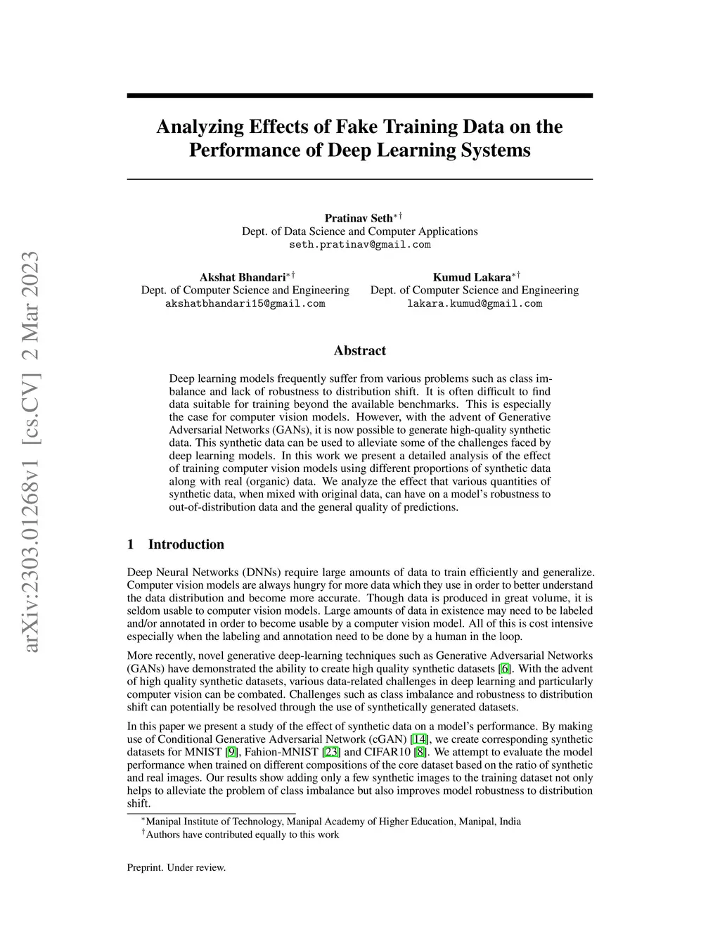 Analyzing Effects of Fake Training Data on the Performance of Deep