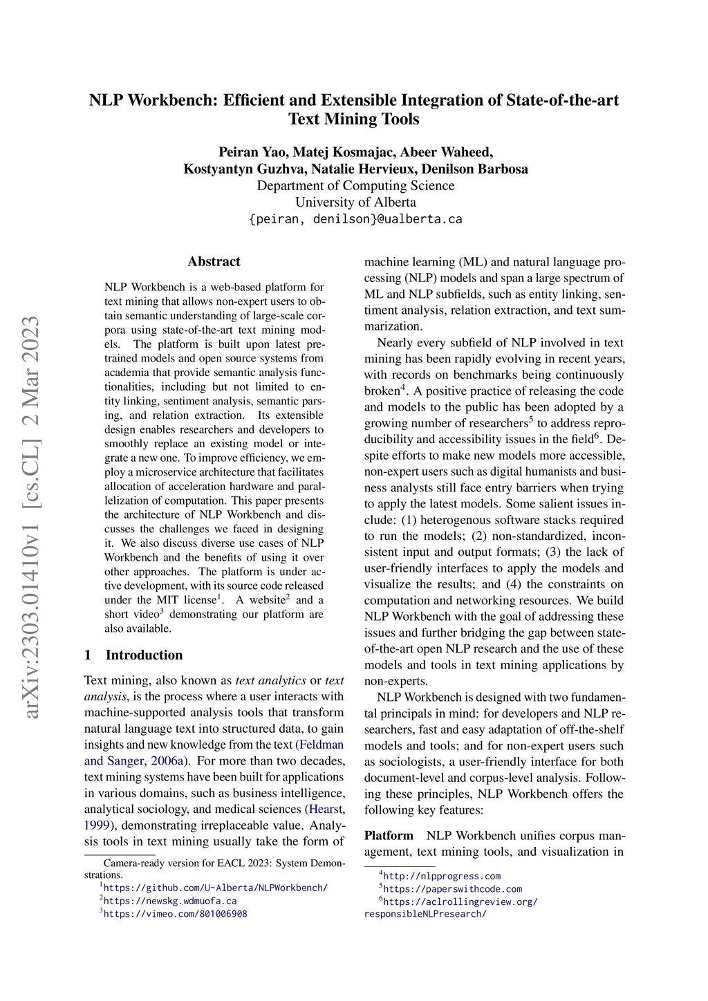 NLP Workbench is a web-based platform for text mining that allows non-expert users to obtain semantic understanding of large-scale corpora using state-of-the-art text mining models. The platform is built upon latest pre-trained models and open source systems from academia that provide semantic analysis functionalities, including but not limited to entity linking, sentiment analysis, semantic parsing, and relation extraction. Its extensible design enables researchers and developers to smoothly replace an existing model or integrate a new one. To improve efficiency, we employ a microservice architecture that facilitates allocation of acceleration hardware and parallelization of computation. This paper presents the architecture of NLP Workbench and discusses the challenges we faced in designing it. We also discuss diverse use cases of NLP Workbench and the benefits of using it over other approaches. The platform is under active development, with its source code released under the MIT license. A website and a short video demonstrating our platform are also available.