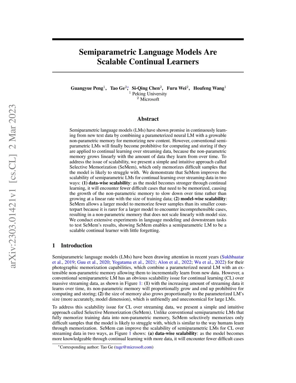 Semiparametric language models (LMs) have shown promise in continuously learning from new text data by combining a parameterized neural LM with a growable non-parametric memory for memorizing new content. However, conventional semiparametric LMs will finally become prohibitive for computing and storing if they are applied to continual learning over streaming data, because the non-parametric memory grows linearly with the amount of data they learn from over time. To address the issue of scalability, we present a simple and intuitive approach called Selective Memorization (SeMem), which only memorizes difficult samples that the model is likely to struggle with. We demonstrate that SeMem improves the scalability of semiparametric LMs for continual learning over streaming data in two ways: (1) data-wise scalability: as the model becomes stronger through continual learning, it will encounter fewer difficult cases that need to be memorized, causing the growth of the non-parametric memory to slow down over time rather than growing at a linear rate with the size of training data; (2) model-wise scalability: SeMem allows a larger model to memorize fewer samples than its smaller counterpart because it is rarer for a larger model to encounter incomprehensible cases, resulting in a non-parametric memory that does not scale linearly with model size. We conduct extensive experiments in language modeling and downstream tasks to test SeMem's results, showing SeMem enables a semiparametric LM to be a scalable continual learner with little forgetting.